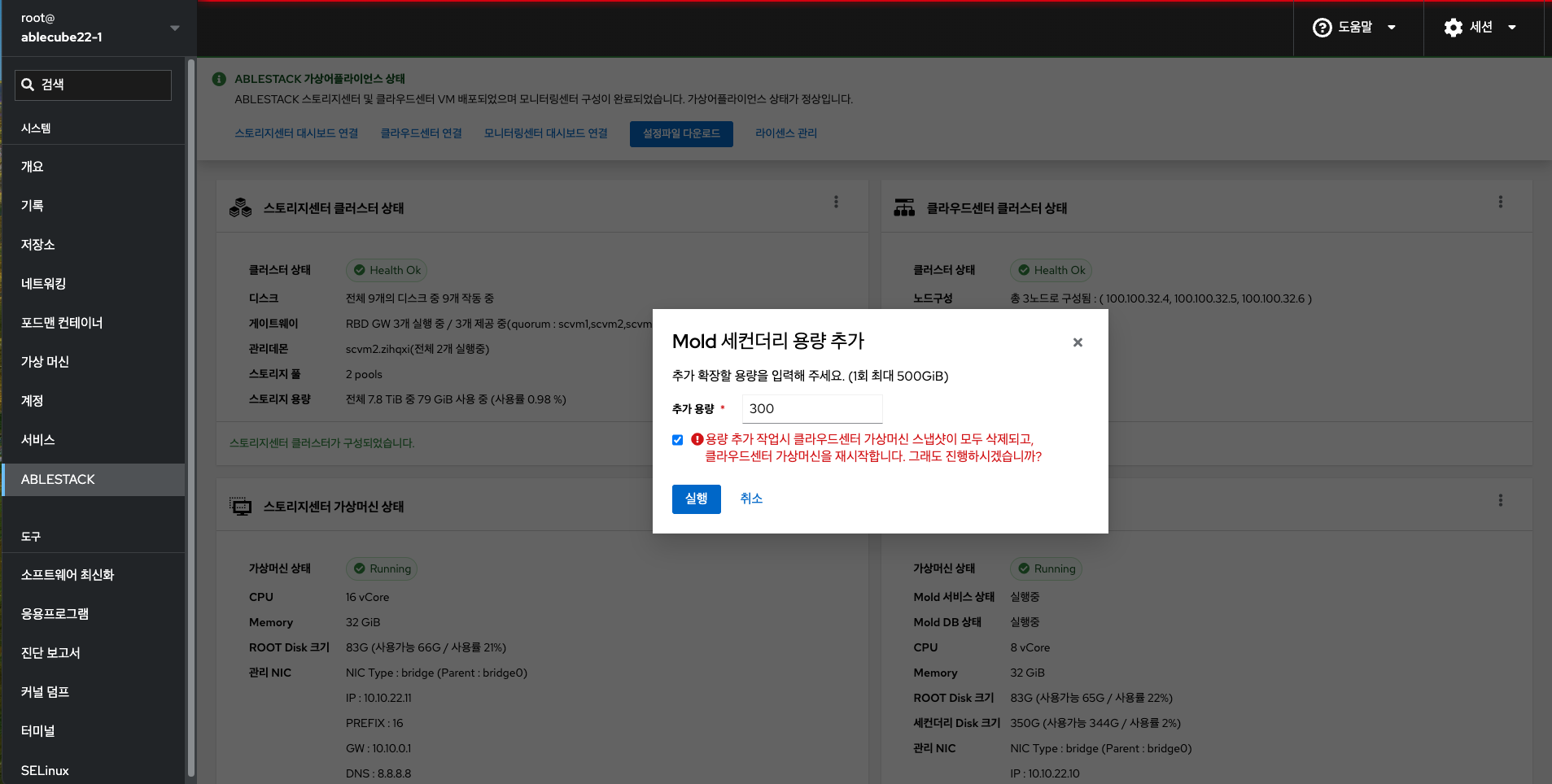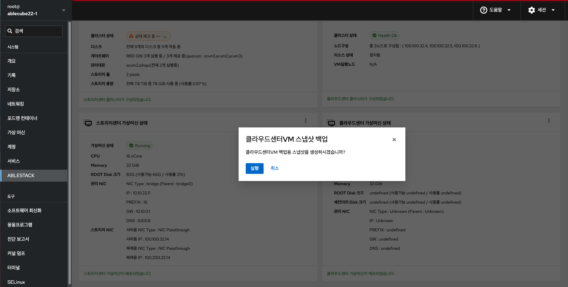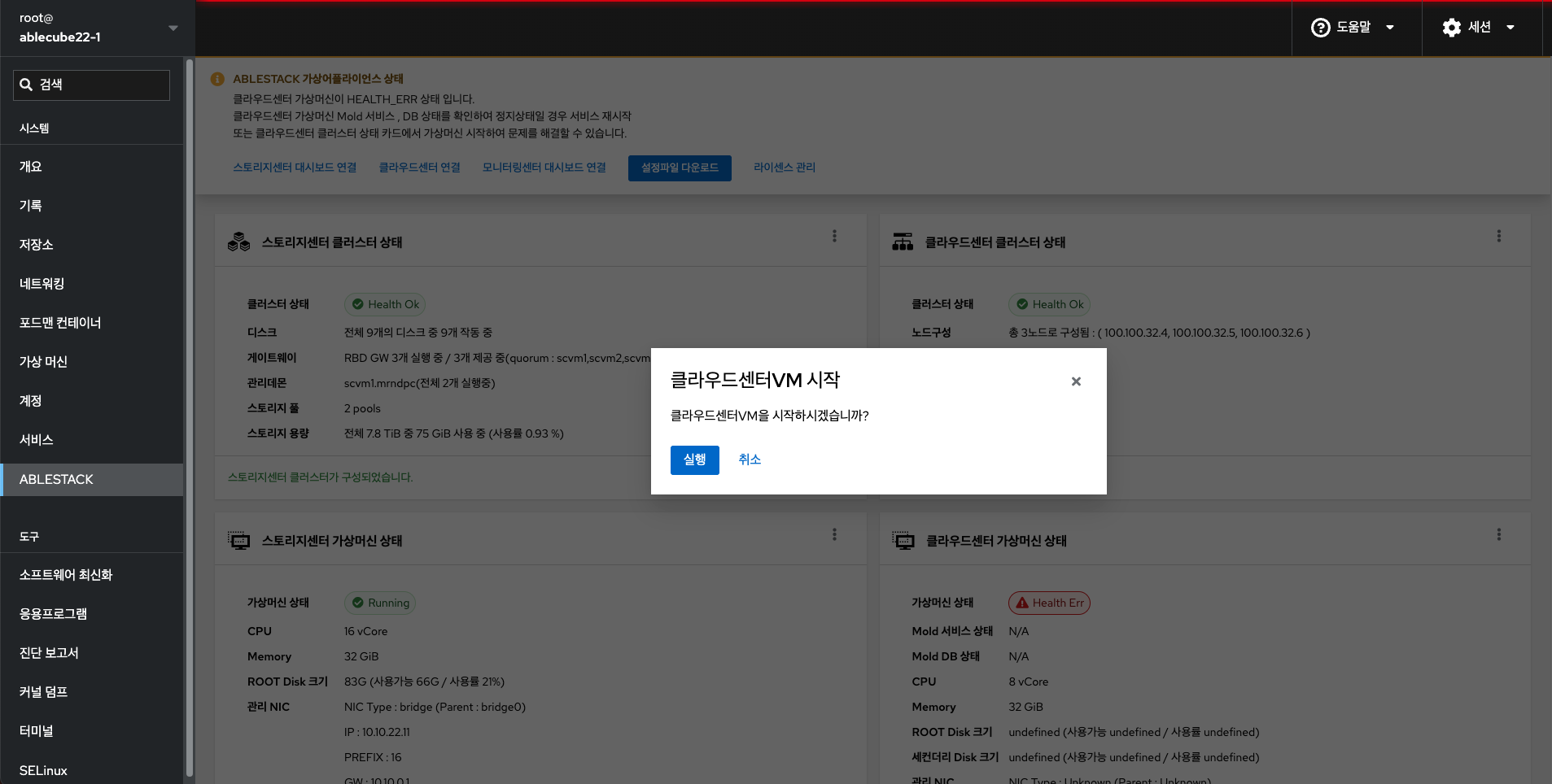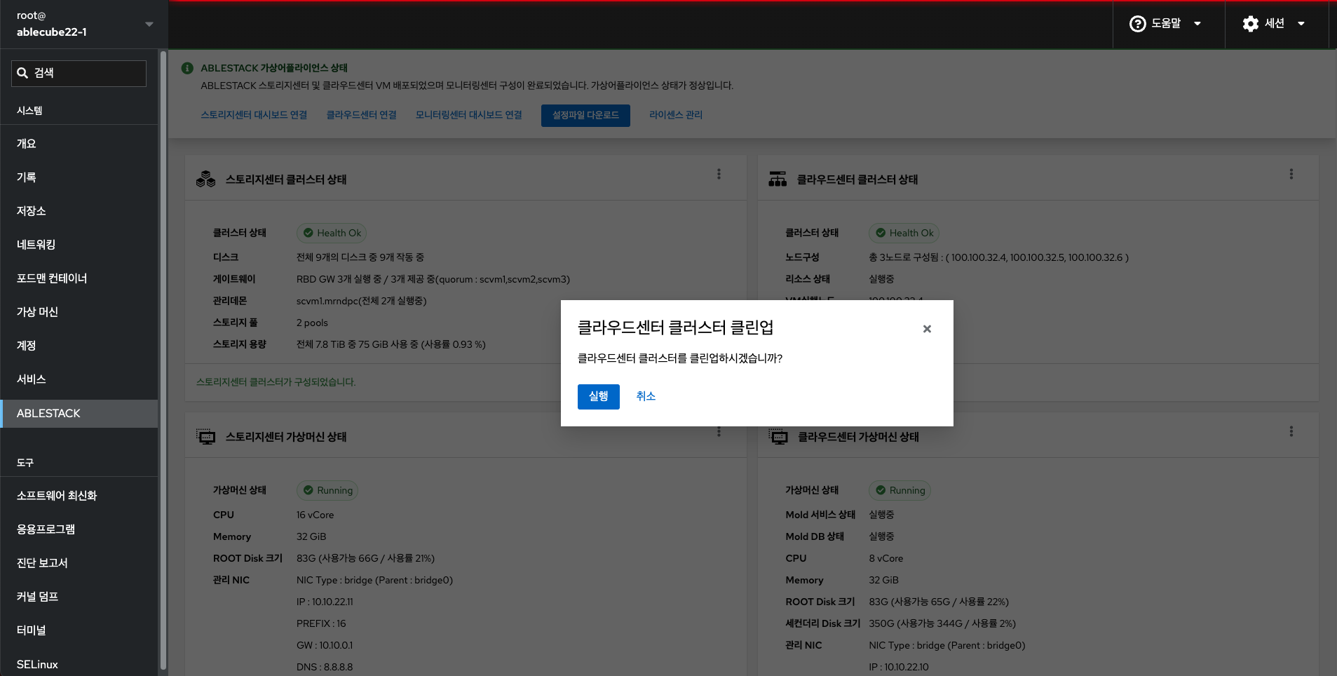 - 클라우드센터 클러스터 상태가 "HEALTH_OK"일 경우 버튼이 활성화됩니다.