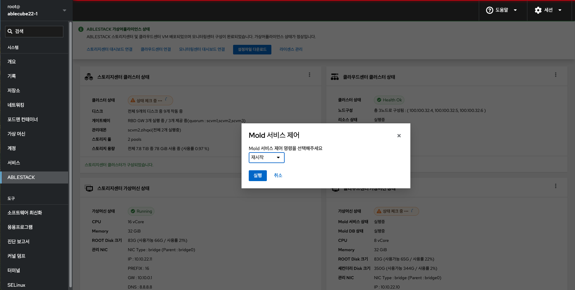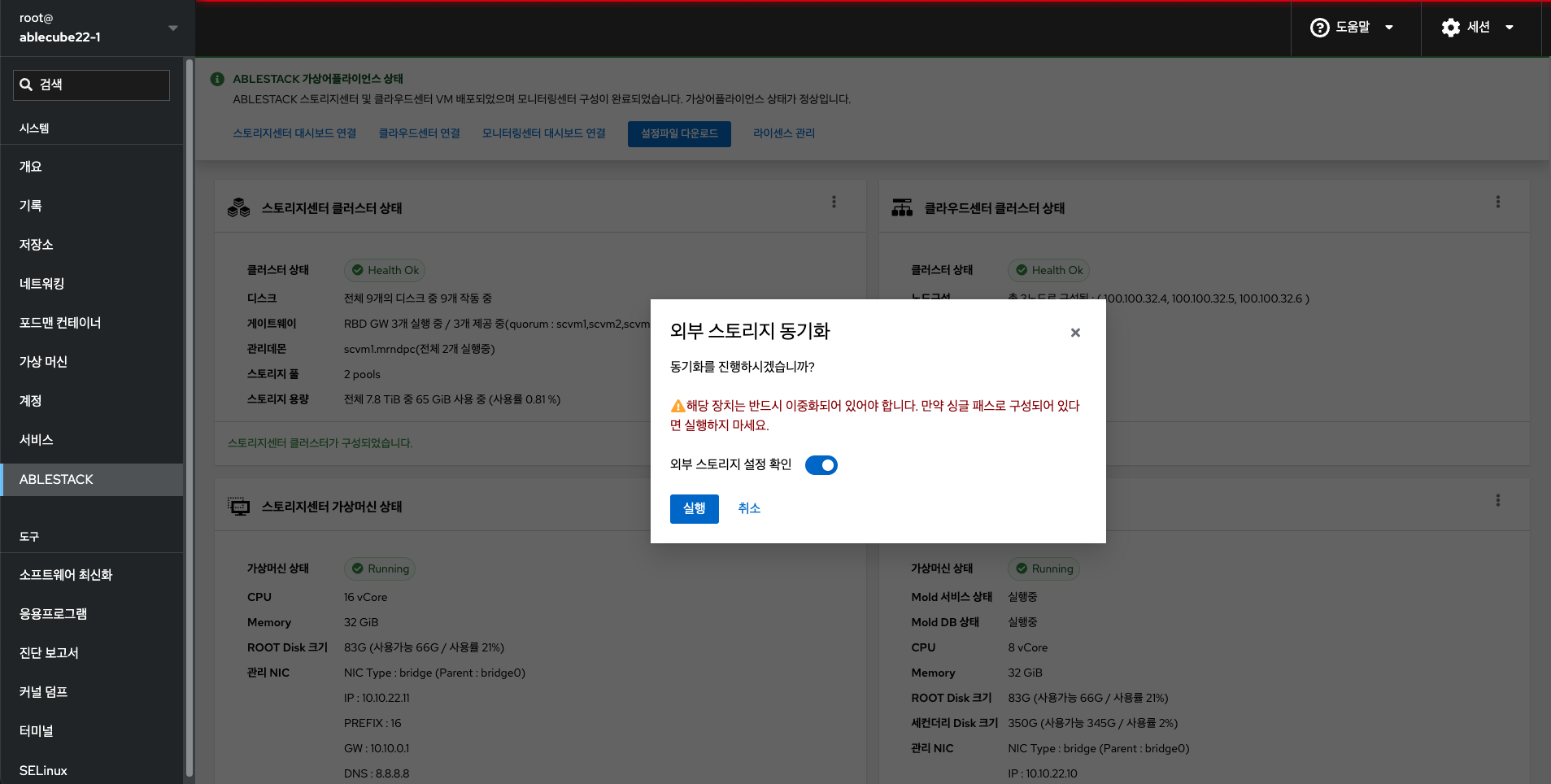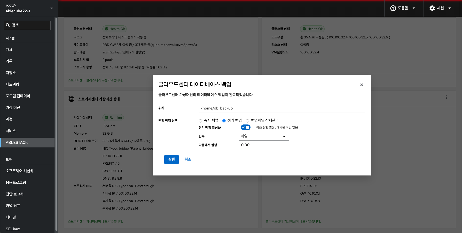 - 클라우드센터 클러스터 상태가 "HEALTH_OK"일 경우 버튼이 활성화됩니다.