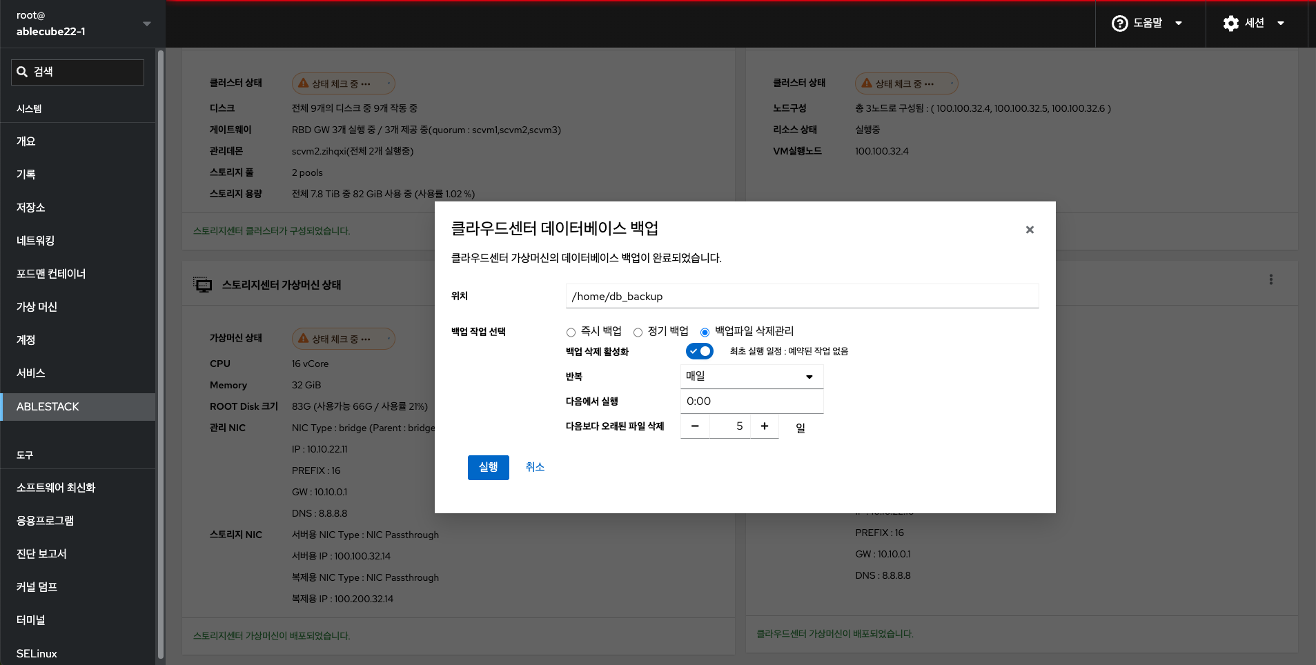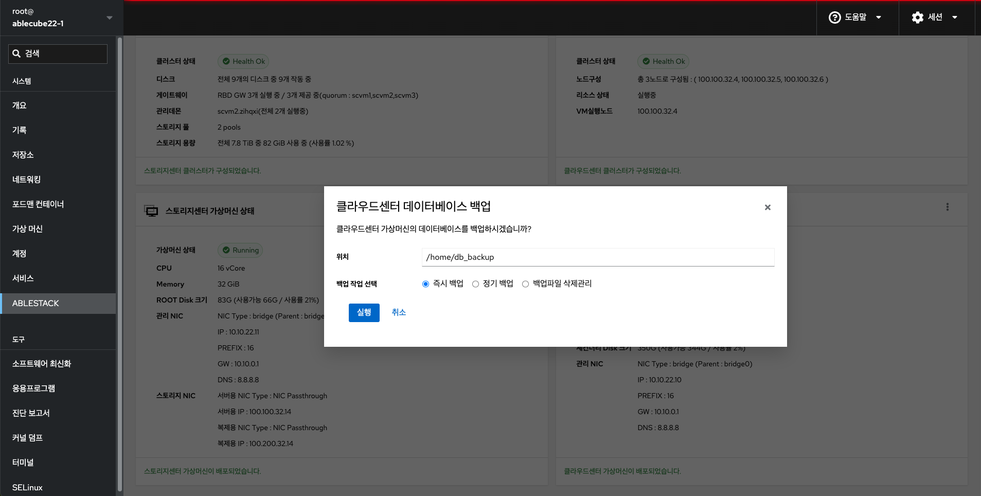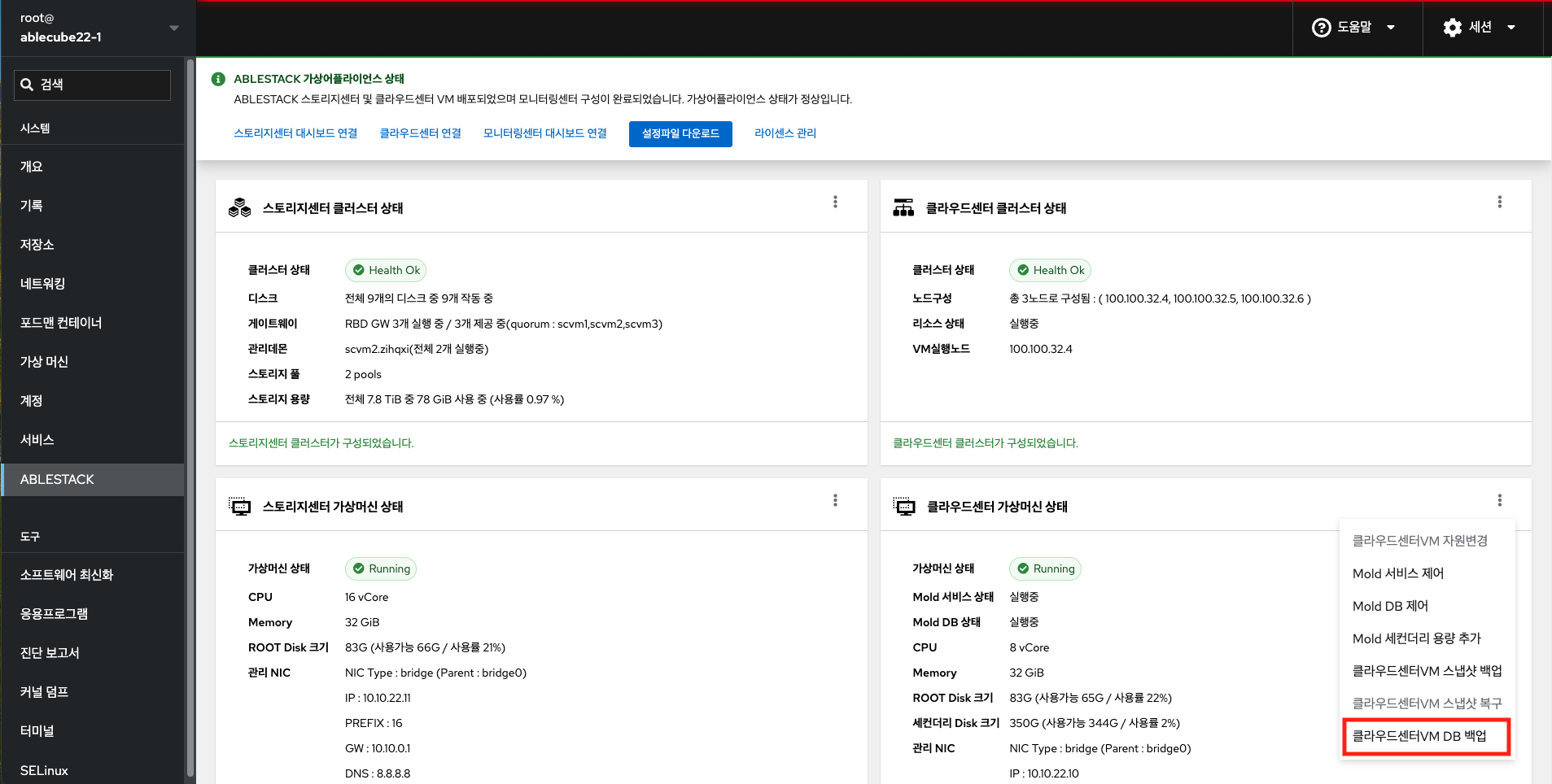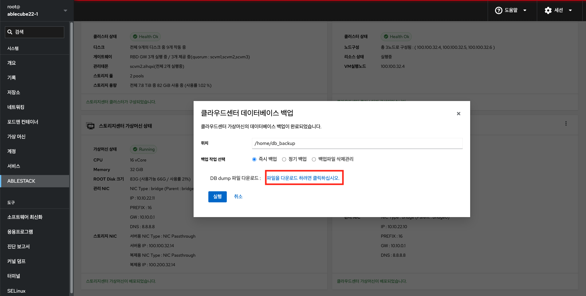 - 클라우드센터 클러스터 상태가 "HEALTH_OK"일 경우 버튼이 활성화됩니다.