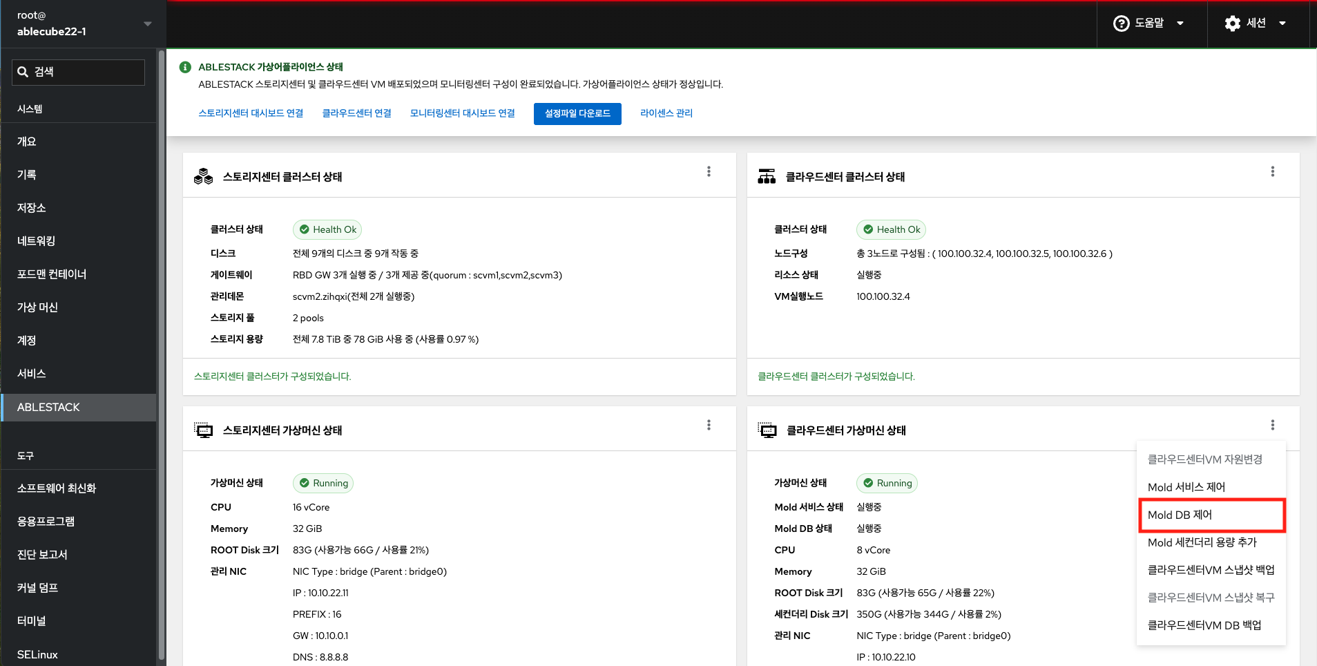 클라우드센터VM의 Mold DB를 제어하기 위한 버튼입니다.