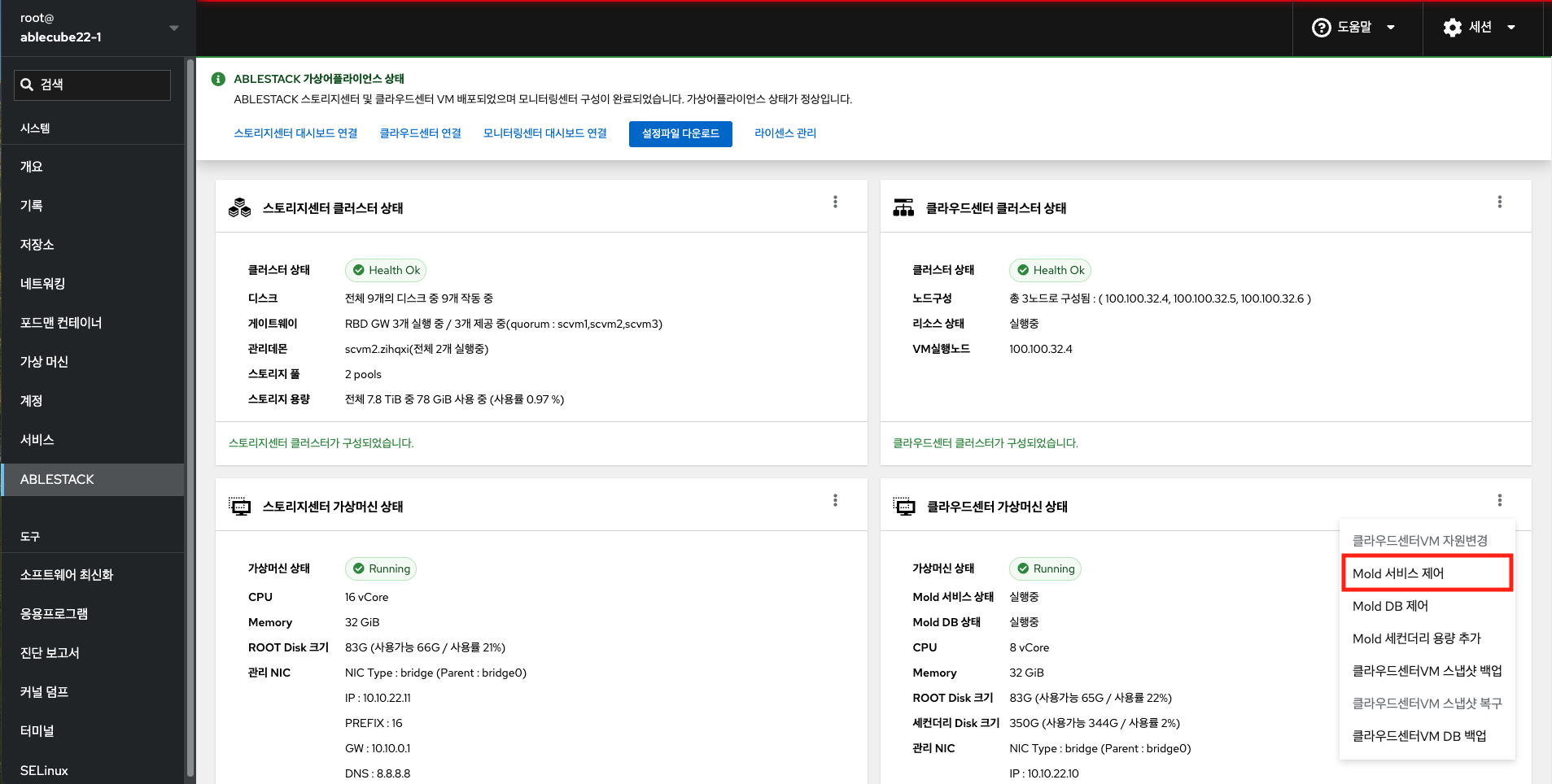 클라우드센터VM의 Mold 서비스를 제어하기 위한 버튼입니다.