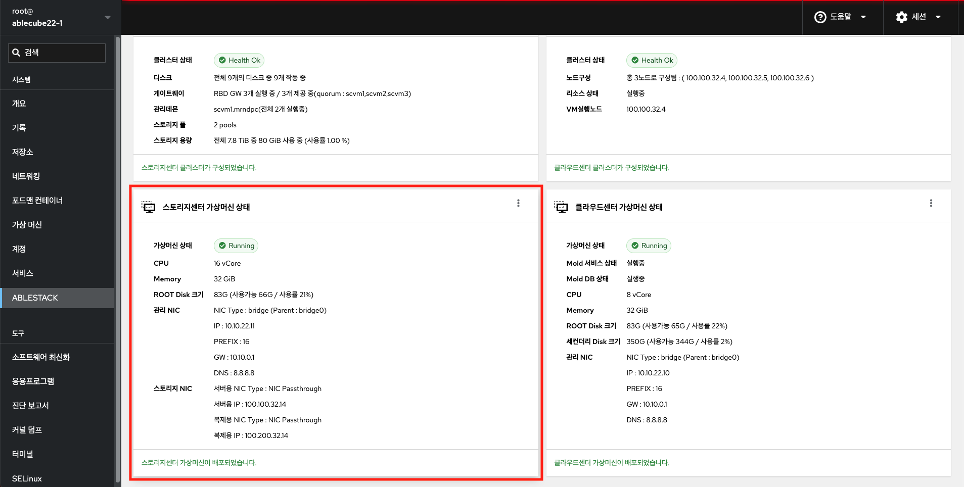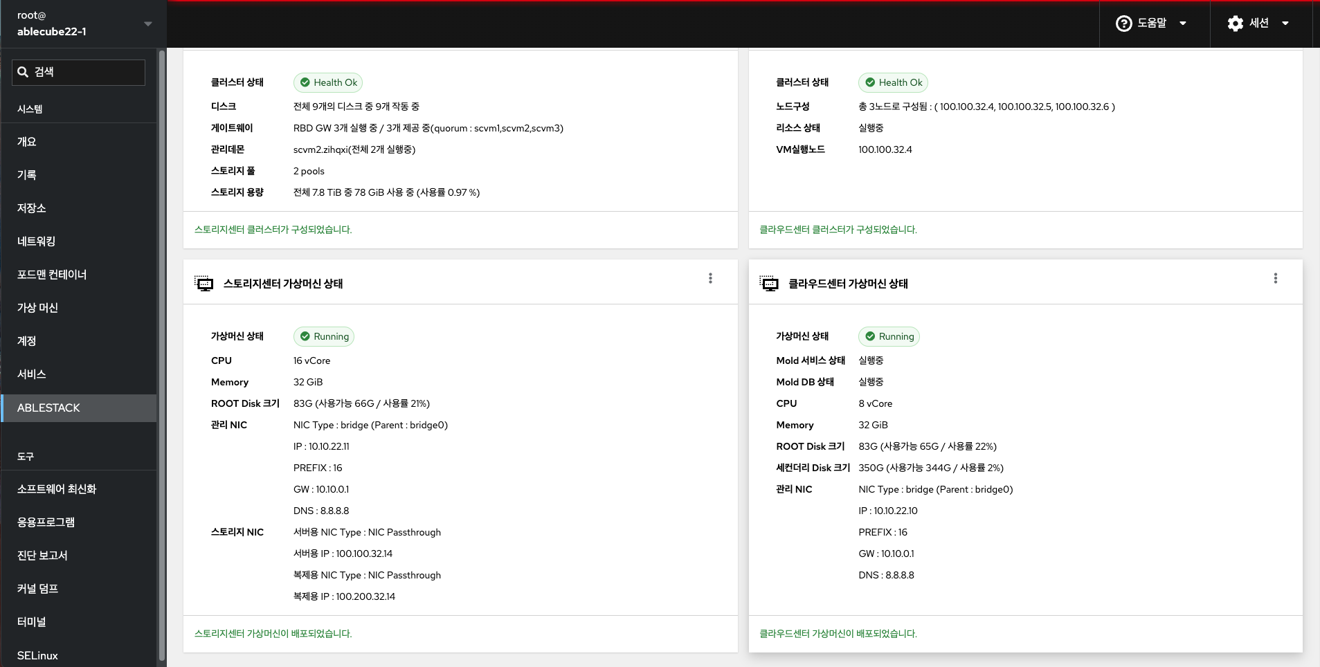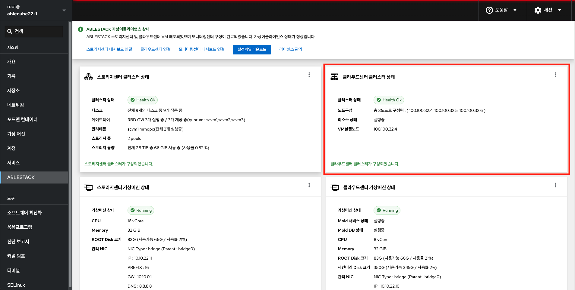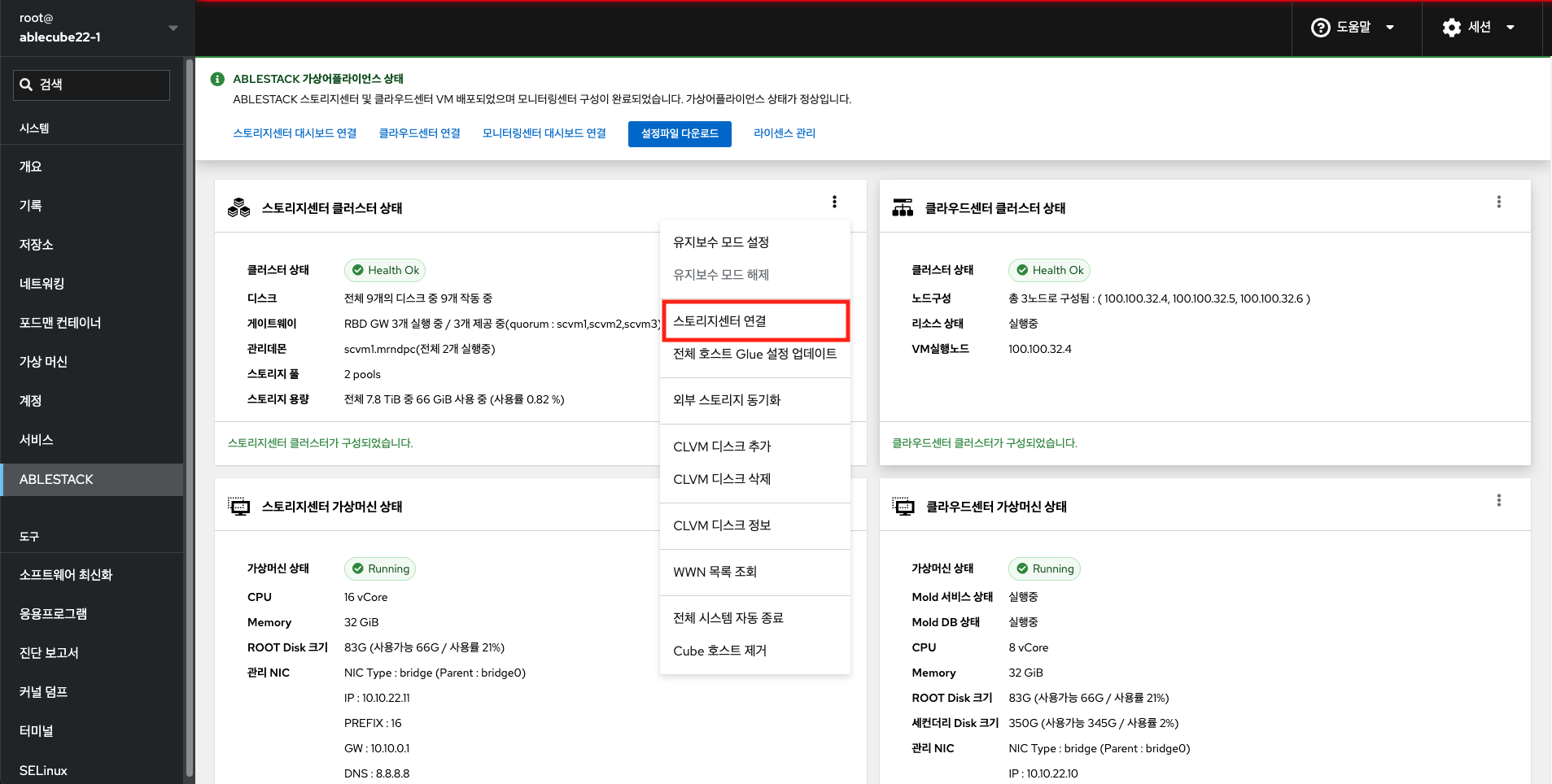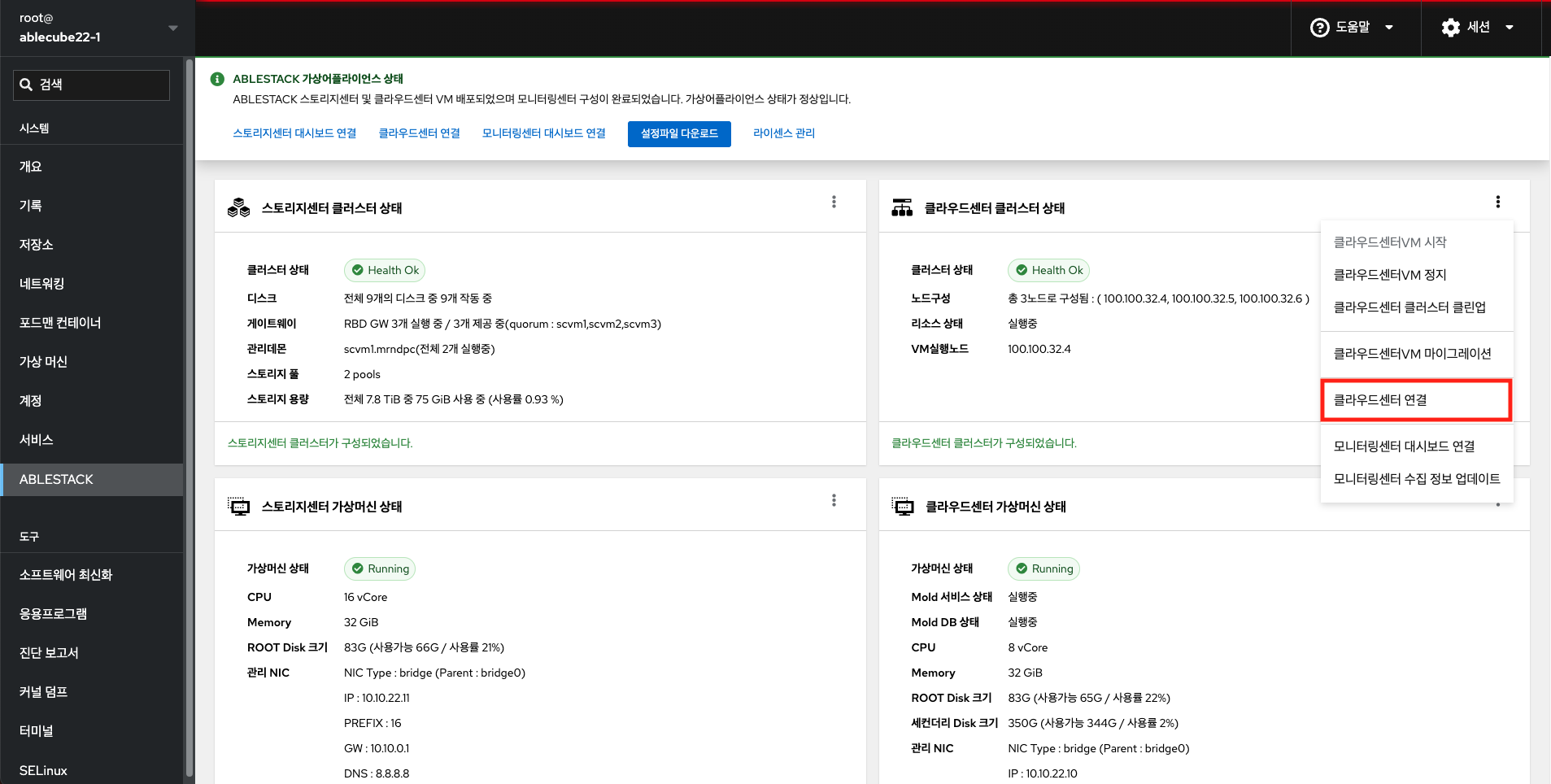 Cube 웹 콘솔의 ABLESTACK 메뉴에서는 HCI로 구성시 스토리지센터 가상머신, 클라우드센터 가상머신 배포와 클러스터를 구성하여 ABLESTACK 가상어플라이언스 관리 및 상태 모니터링을 제공합니다.