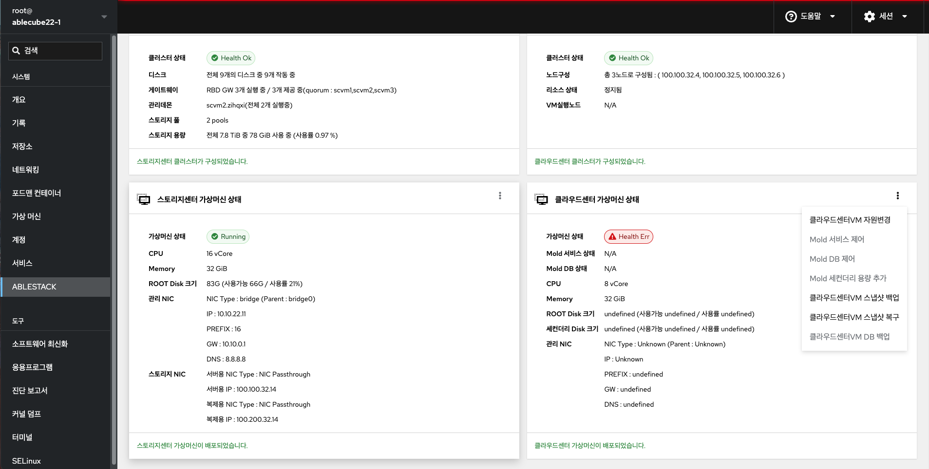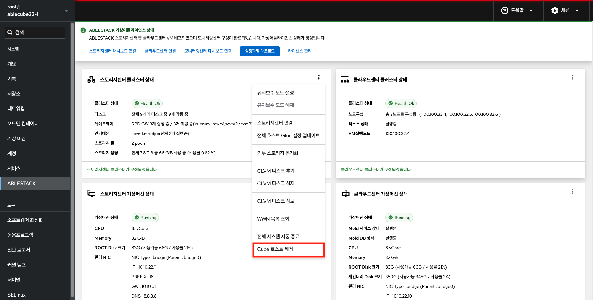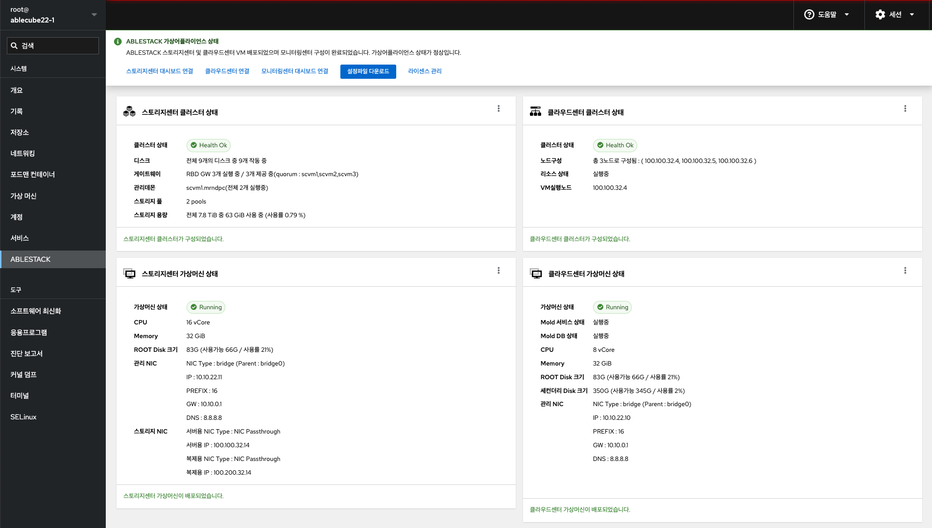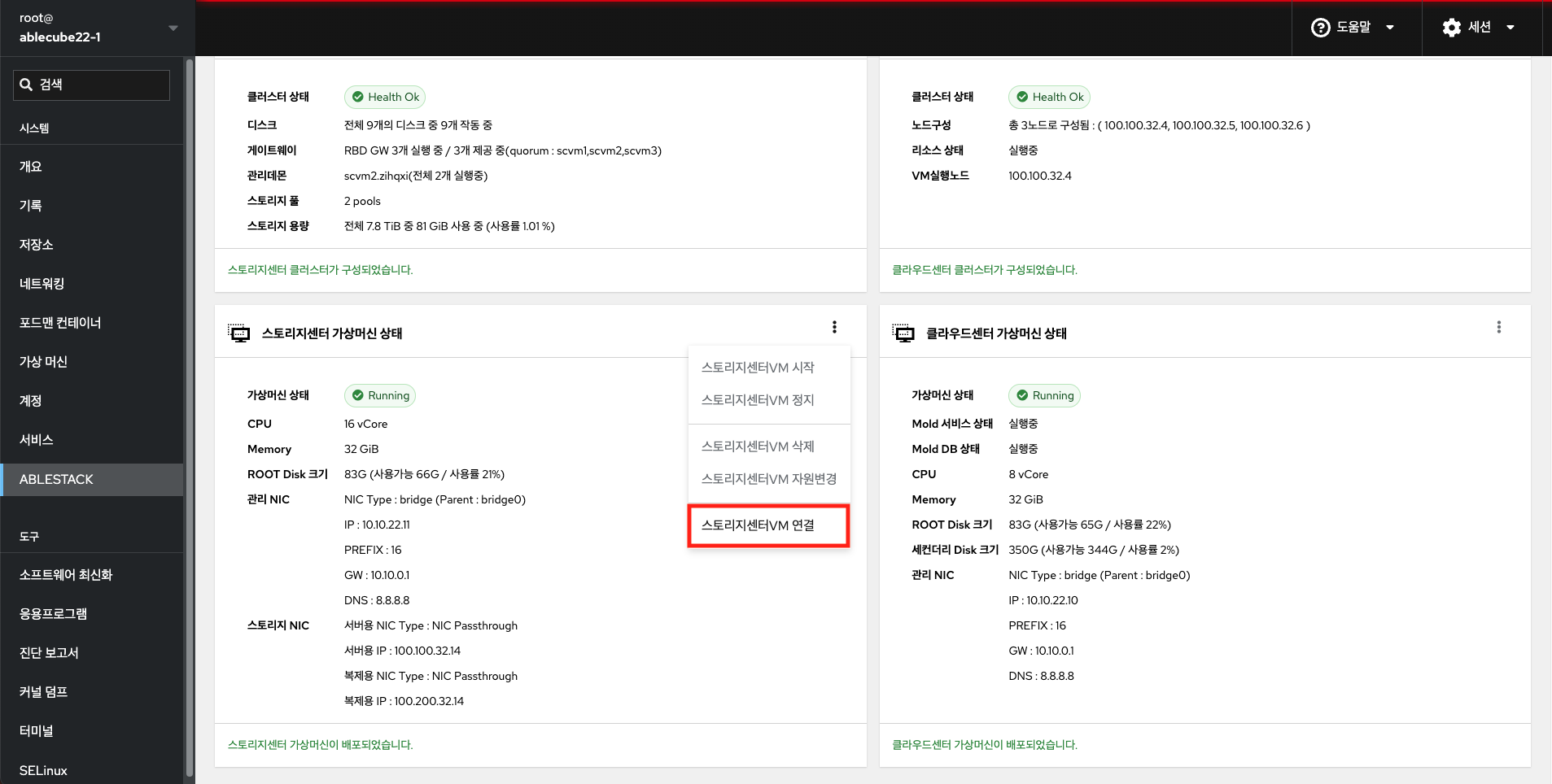 Cube 웹 콘솔의 ABLESTACK 메뉴에서는 HCI로 구성시 스토리지센터 가상머신, 클라우드센터 가상머신 배포와 클러스터를 구성하여 ABLESTACK 가상어플라이언스 관리 및 상태 모니터링을 제공합니다.