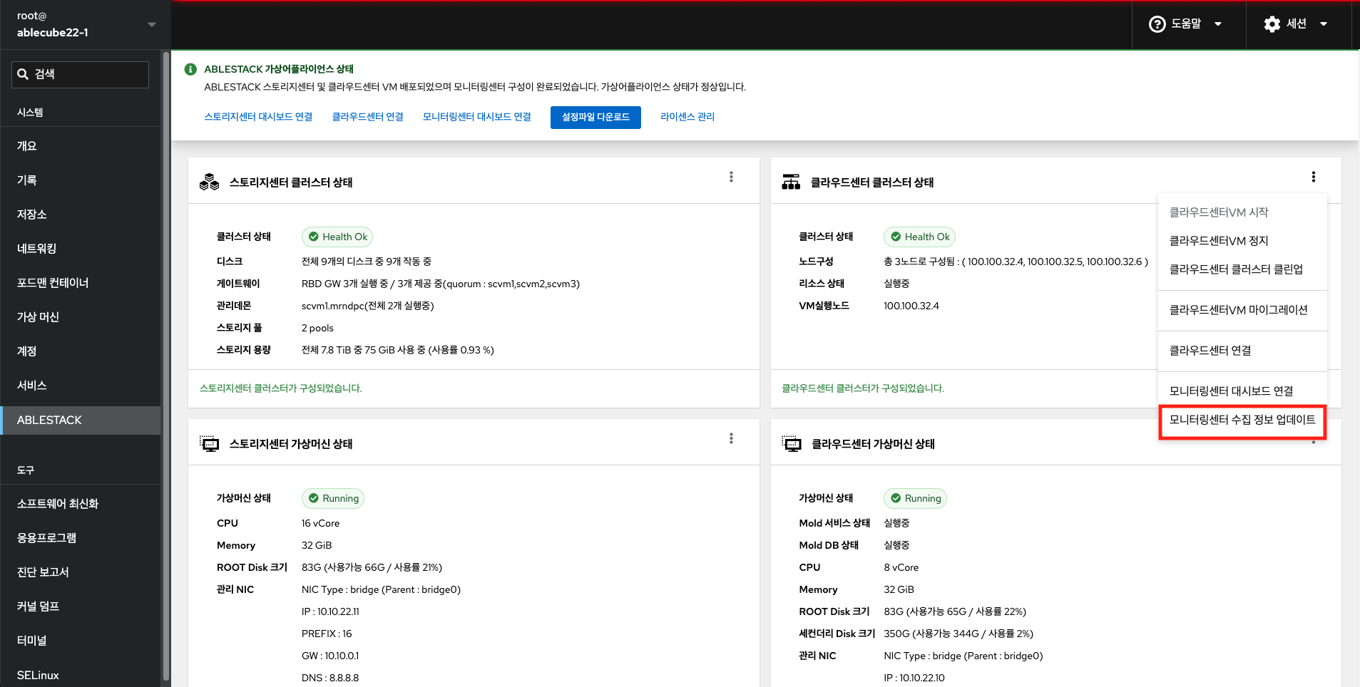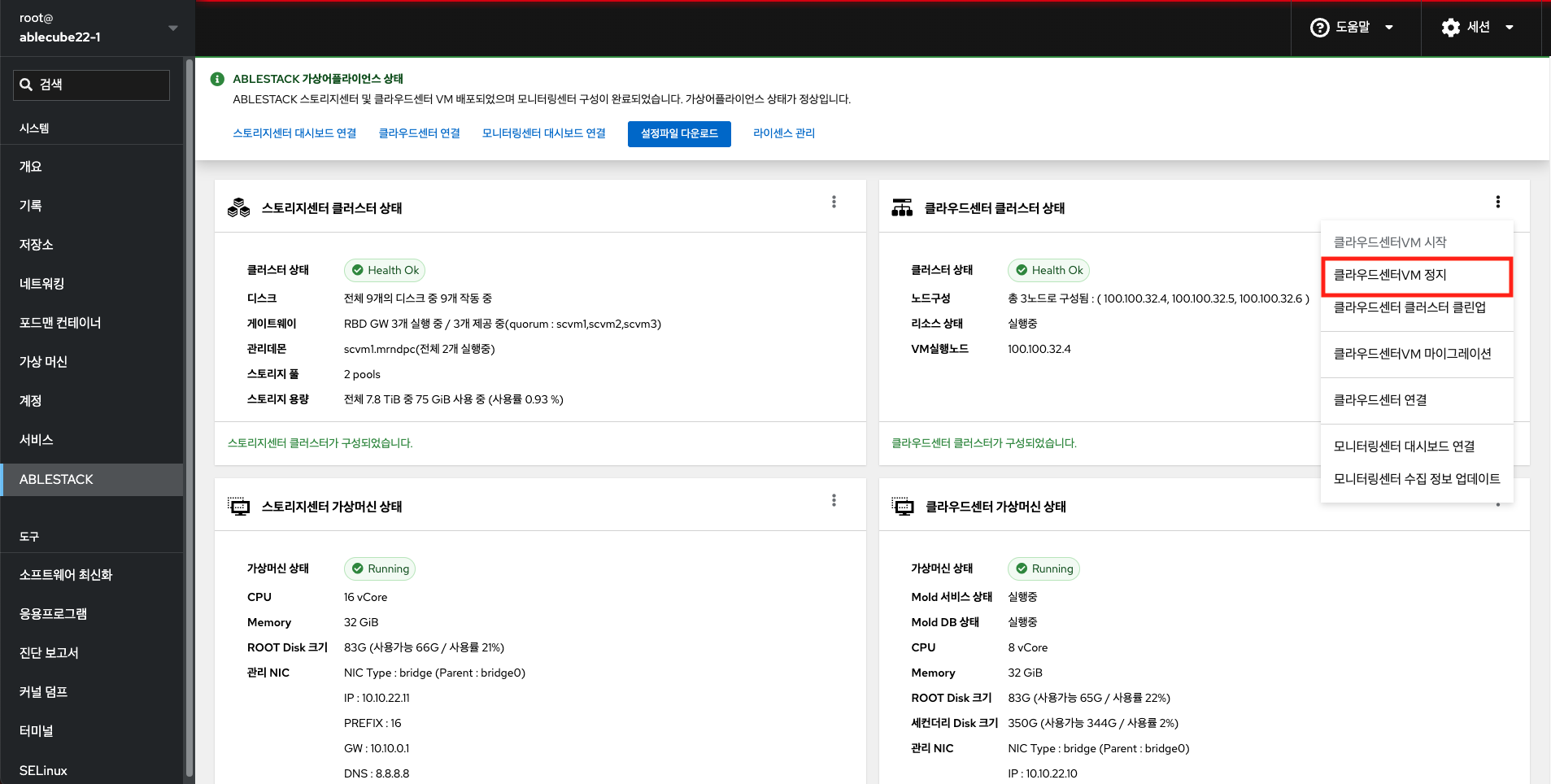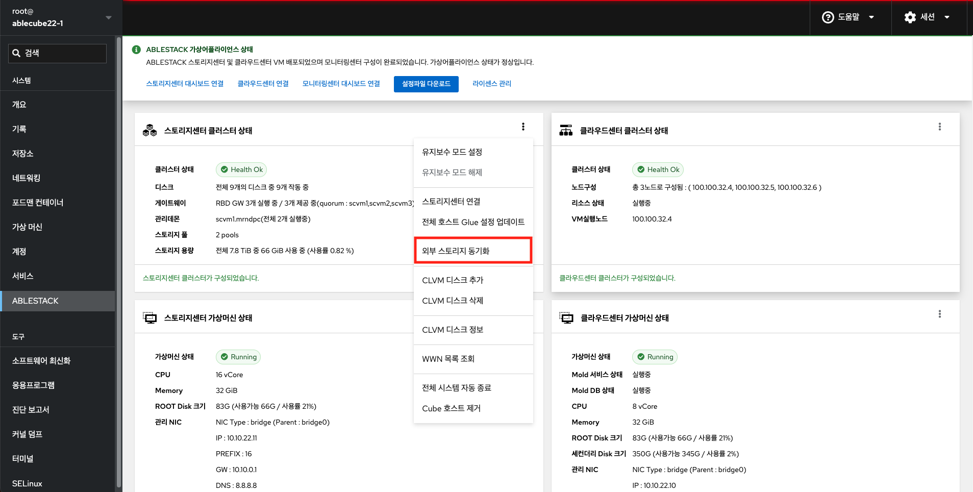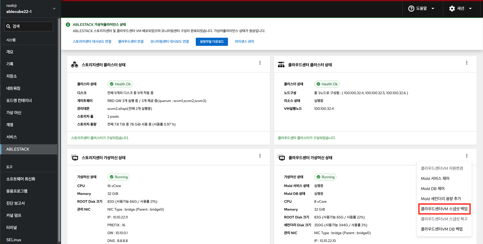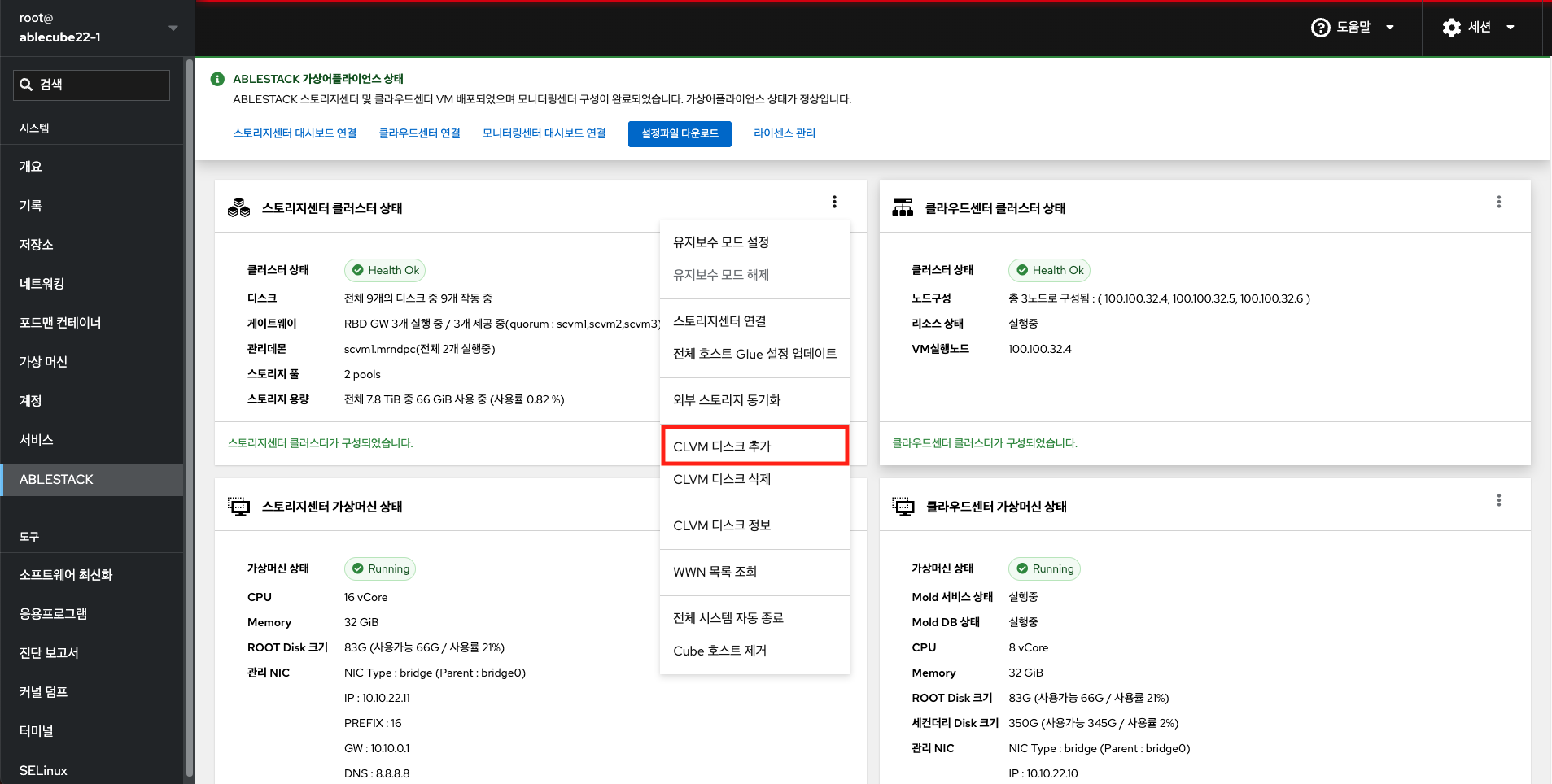 Cube 웹 콘솔의 ABLESTACK 메뉴에서는 HCI로 구성시 스토리지센터 가상머신, 클라우드센터 가상머신 배포와 클러스터를 구성하여 ABLESTACK 가상어플라이언스 관리 및 상태 모니터링을 제공합니다.