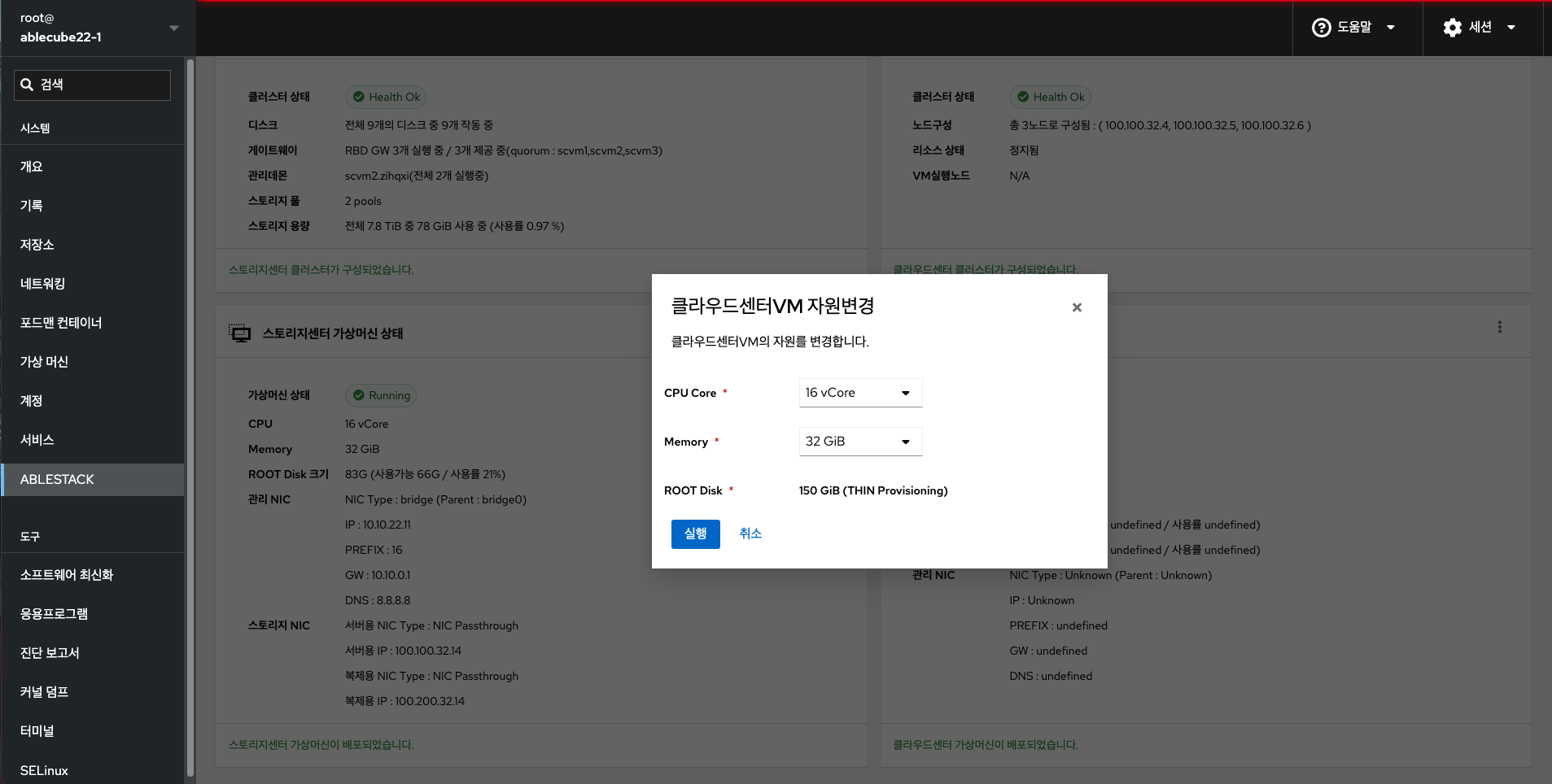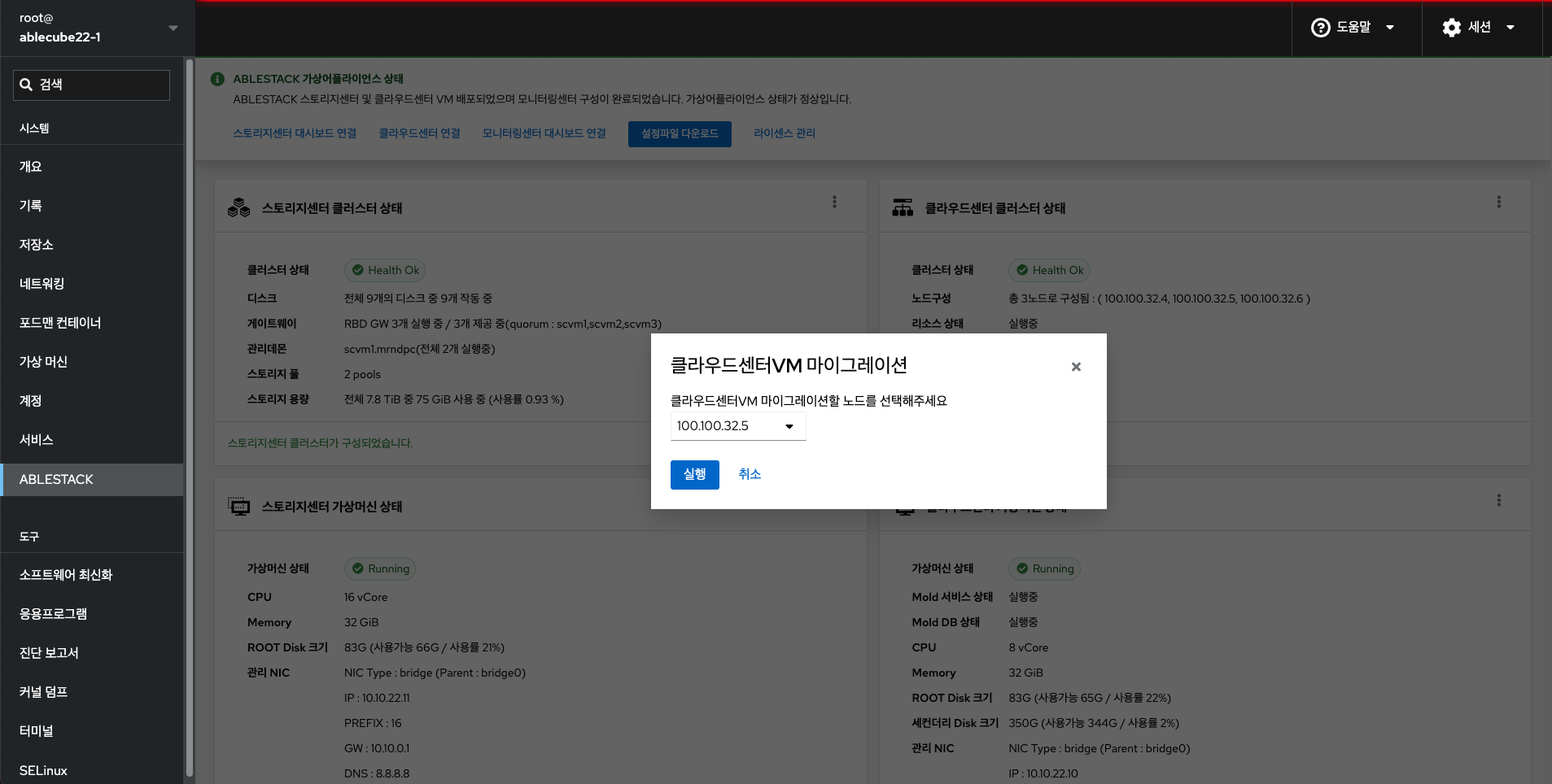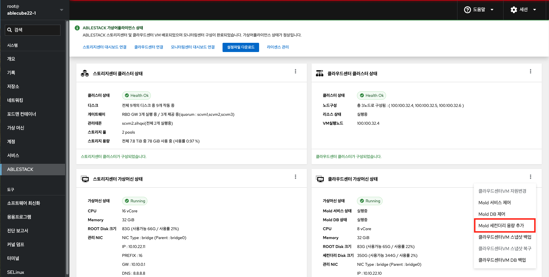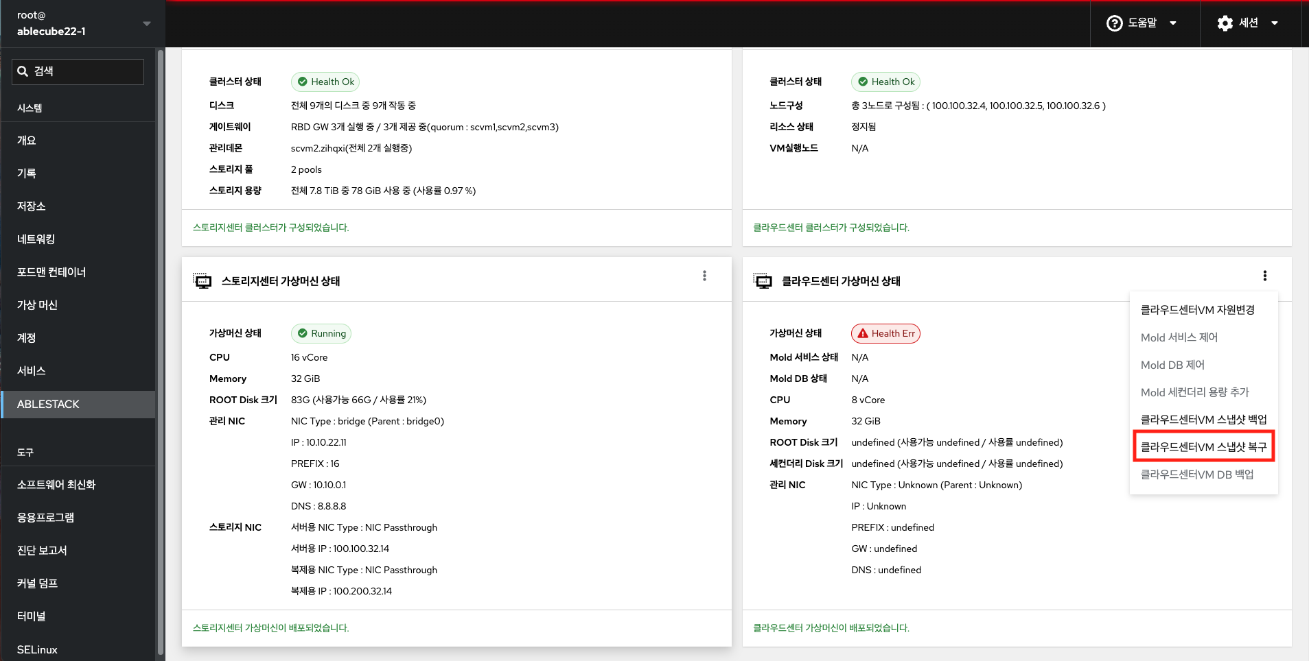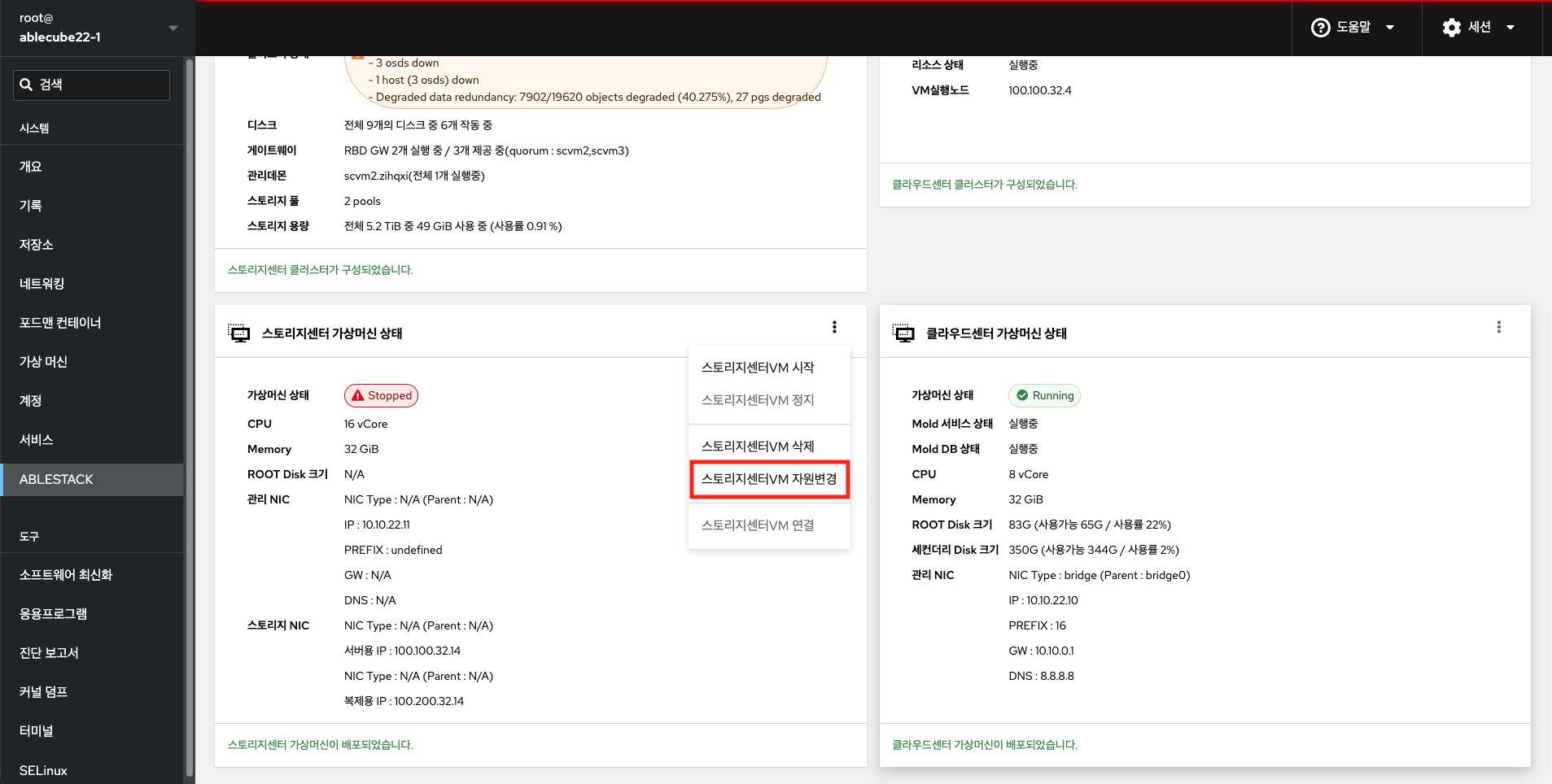 Cube 웹 콘솔의 ABLESTACK 메뉴에서는 HCI로 구성시 스토리지센터 가상머신, 클라우드센터 가상머신 배포와 클러스터를 구성하여 ABLESTACK 가상어플라이언스 관리 및 상태 모니터링을 제공합니다.