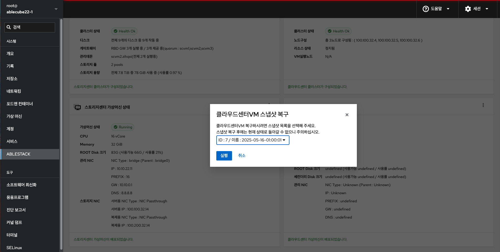 - 클라우드센터VM 스냅샷 복구 팝업을 호출합니다.
