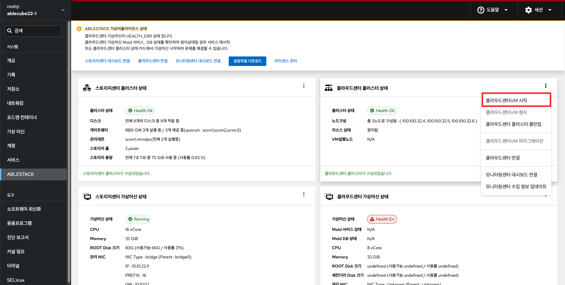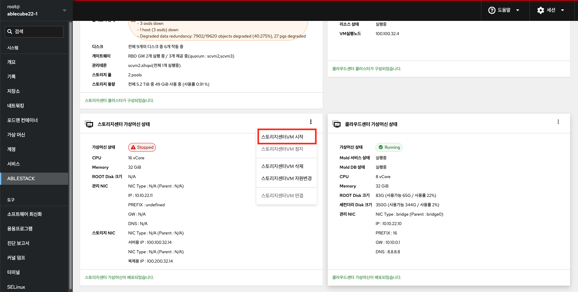 - 스토리지센터 가상머신(SCVM)가 정지 상태일 경우 활성화됩니다.