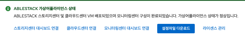 스토리지 가상머신, 클라우스센터 가상머신의 배포 및 클러스터 구성여부에 따라 현 상태를 메시지로 표현해 줍니다. 각 단계별 수행해야 되는 필수 구성 정보를 확인하여 설치 마법사 및 대시보드 링크를 제공하며 ABLESTACK 가상 어플라이언스 구성에 편의를 제공합니다.