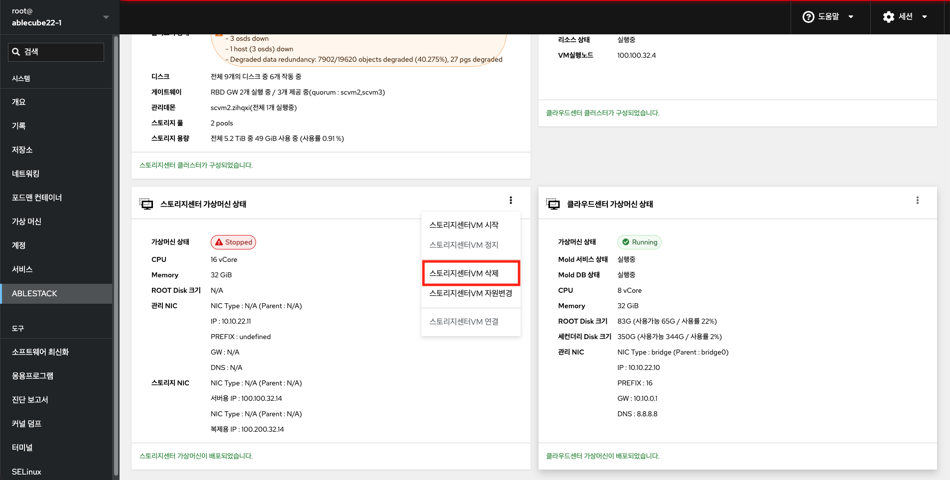 - 스토리지센터VM 삭제 을 클릭합니다.