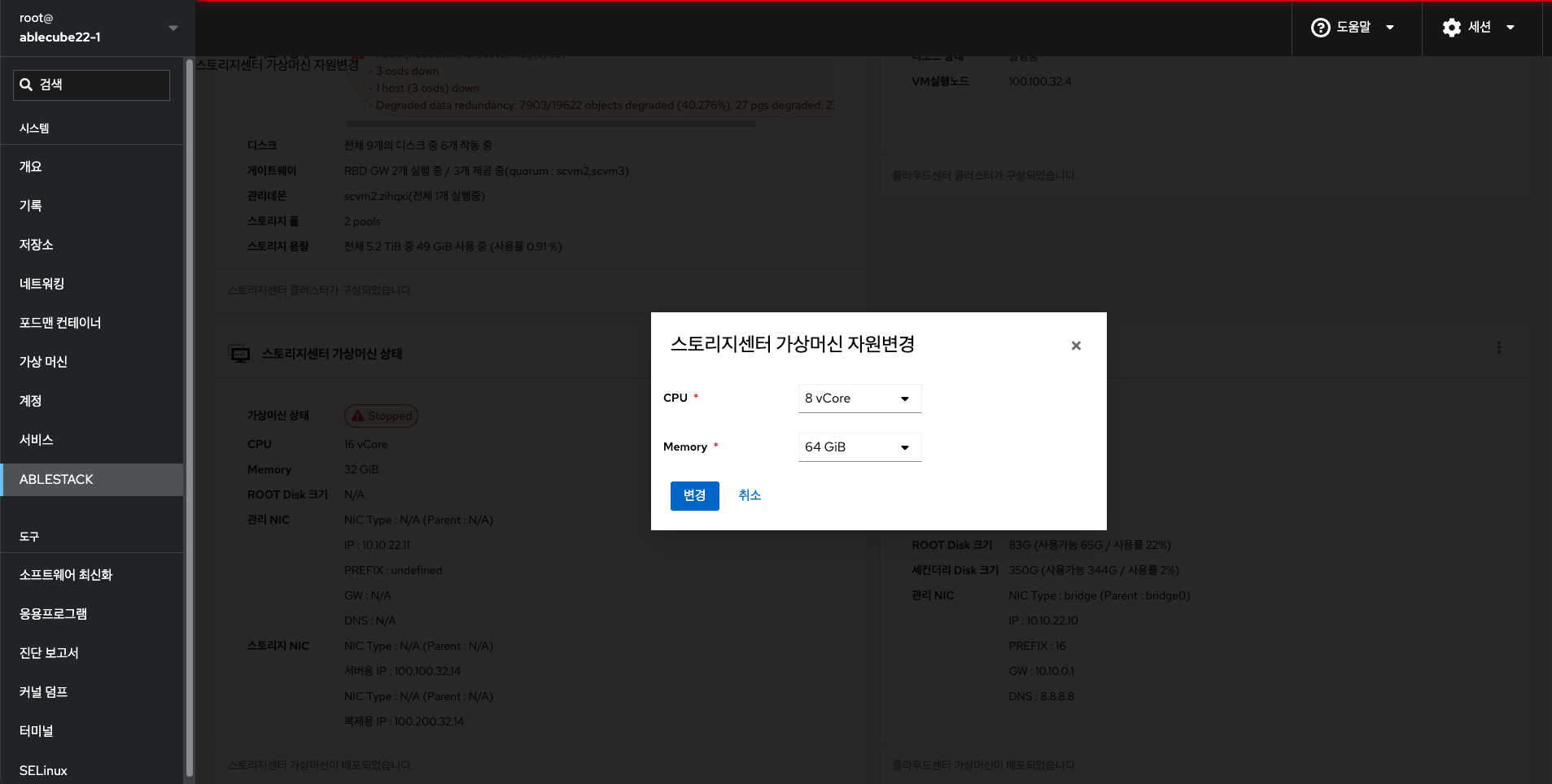 - 변경 버튼을 클릭하여 스토리지센터 가상머신의 자원을 변경합니다.