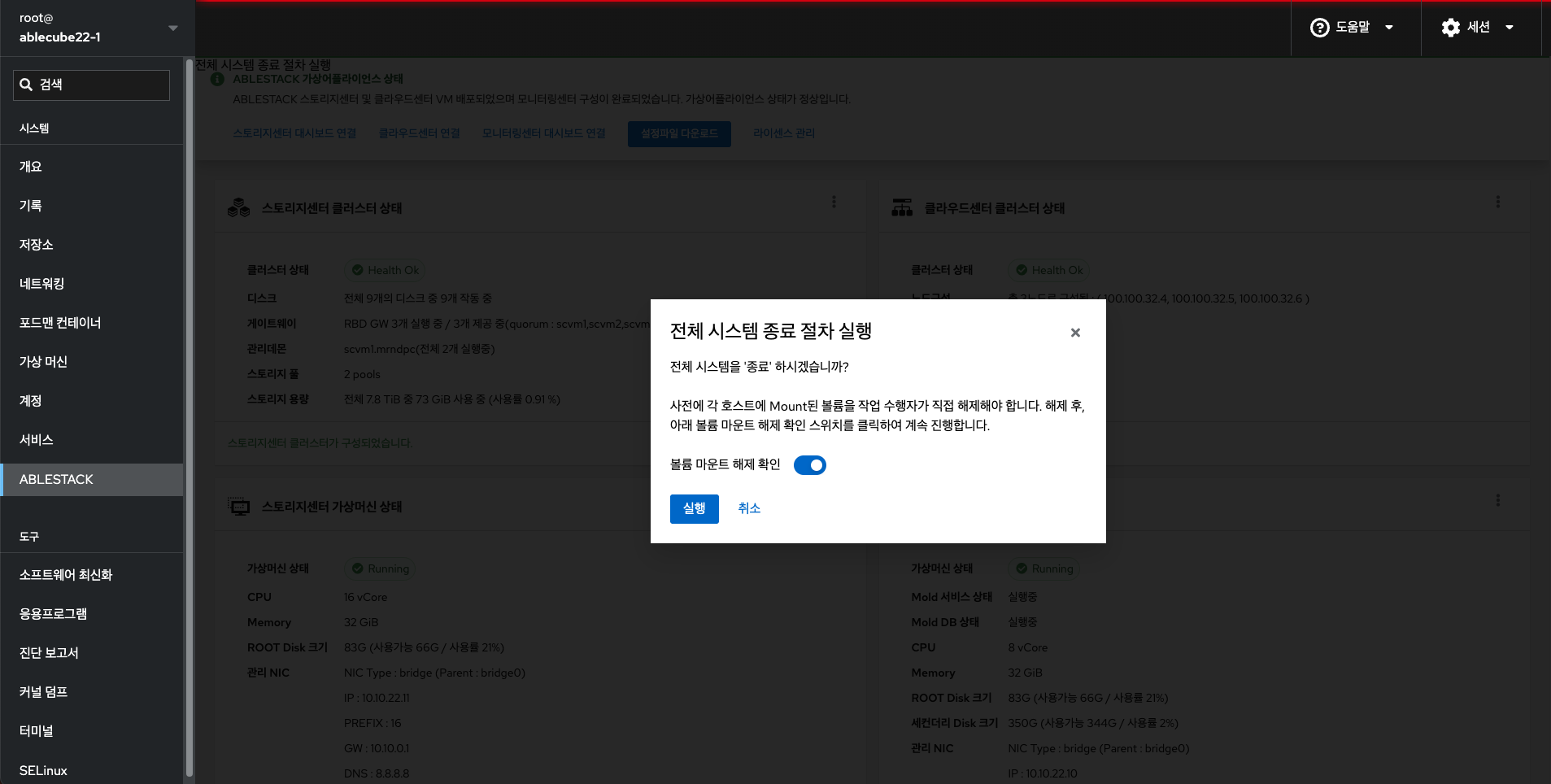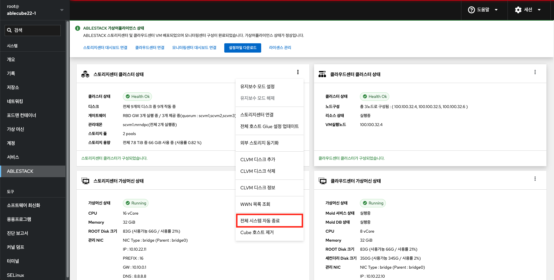 ABLESTACK 전체 시스템을 종료하기 위한 기능으로, CUBE에서 실행되는 절차를 통합하여 자동으로 실행하도록 하는 기능입니다.