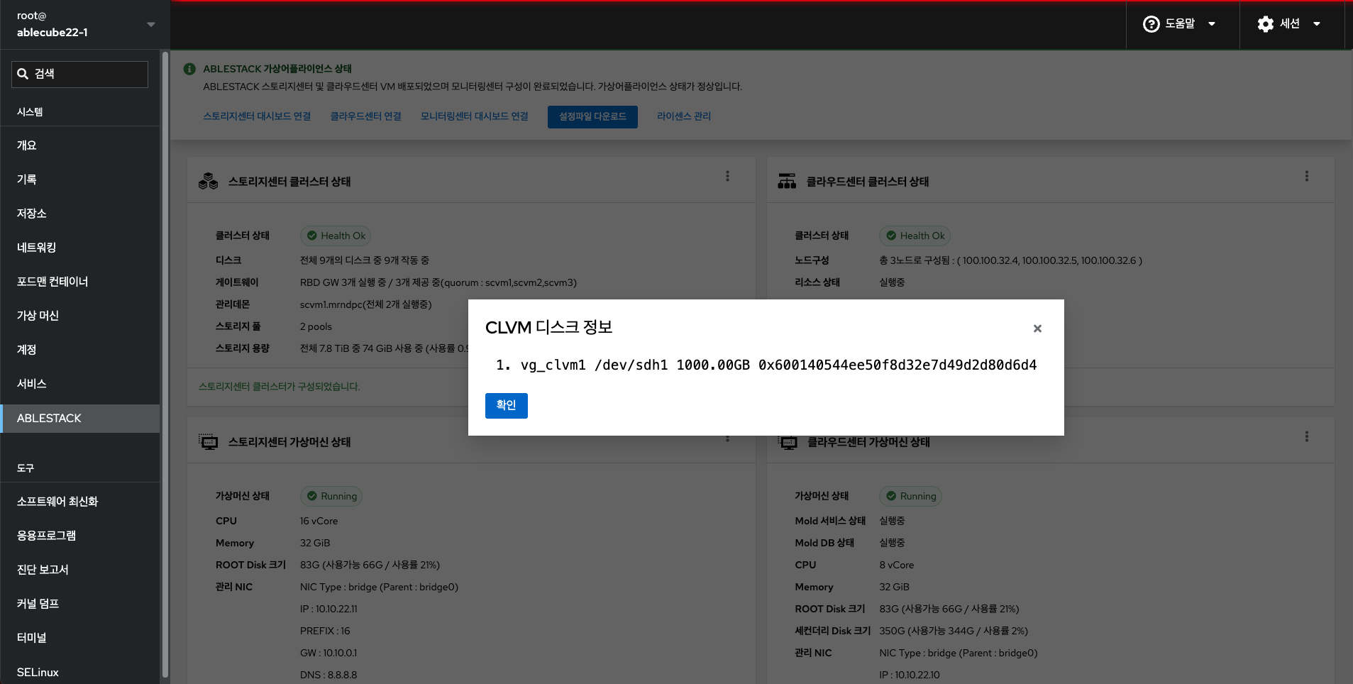 - 확인 버튼을 클릭하여 CLVM 디스크 정보 팝업을 닫습니다.