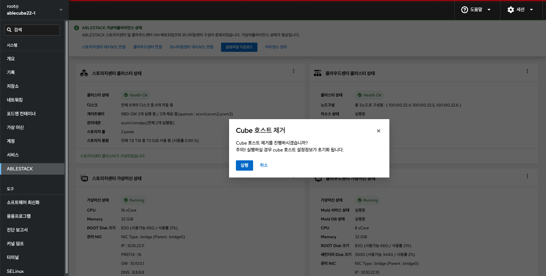 - 스토리지 클러스터가 구성된 경우 삭제 하실 수 없습니다.