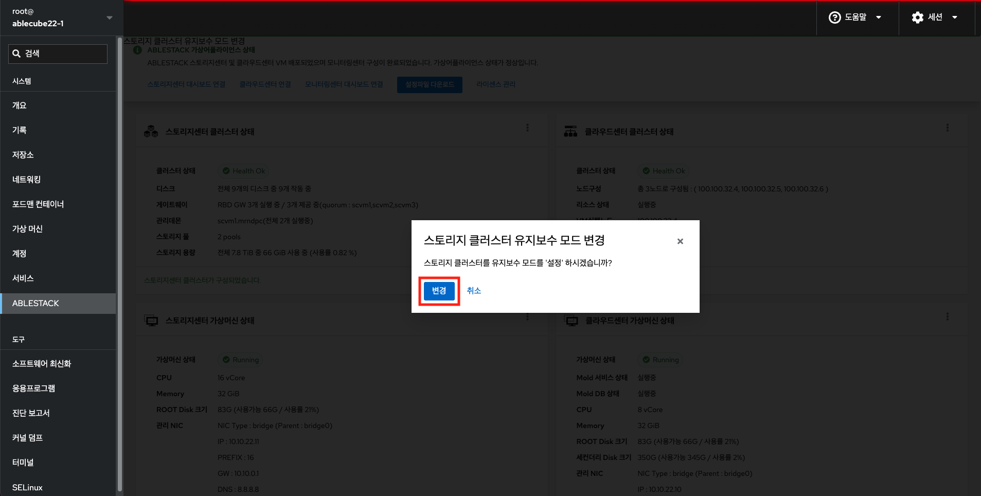- 변경 버튼을 클릭하여 스토리지센터 클러스터 유지보수 모드로 설정합니다.