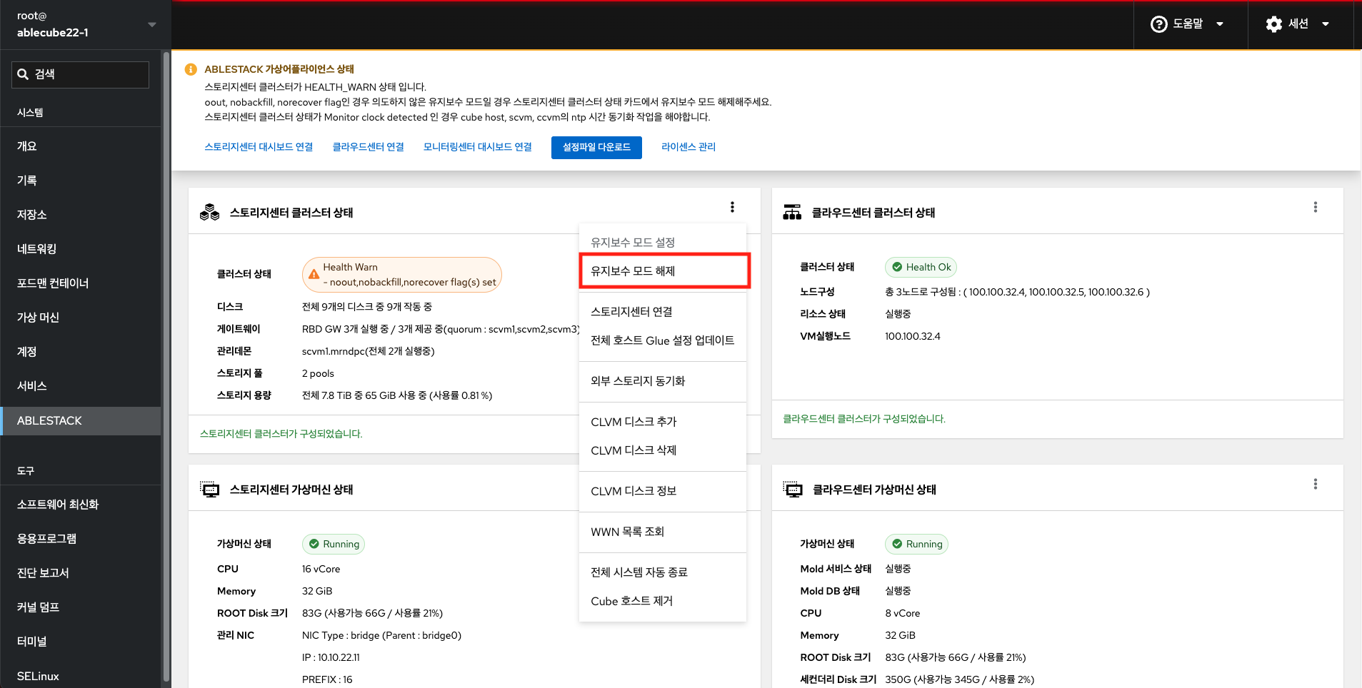 스토리지센터 클러스터를 유지보수모드 해제 할 수 있도록 실행하는 버튼입니다.