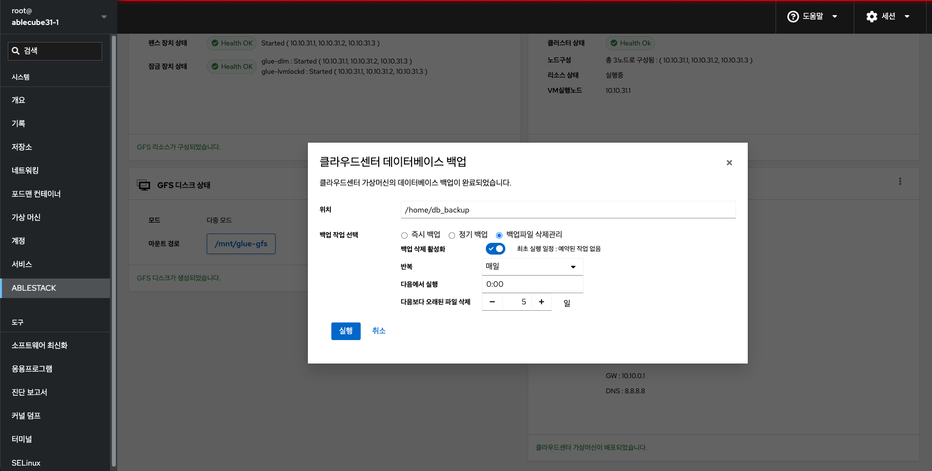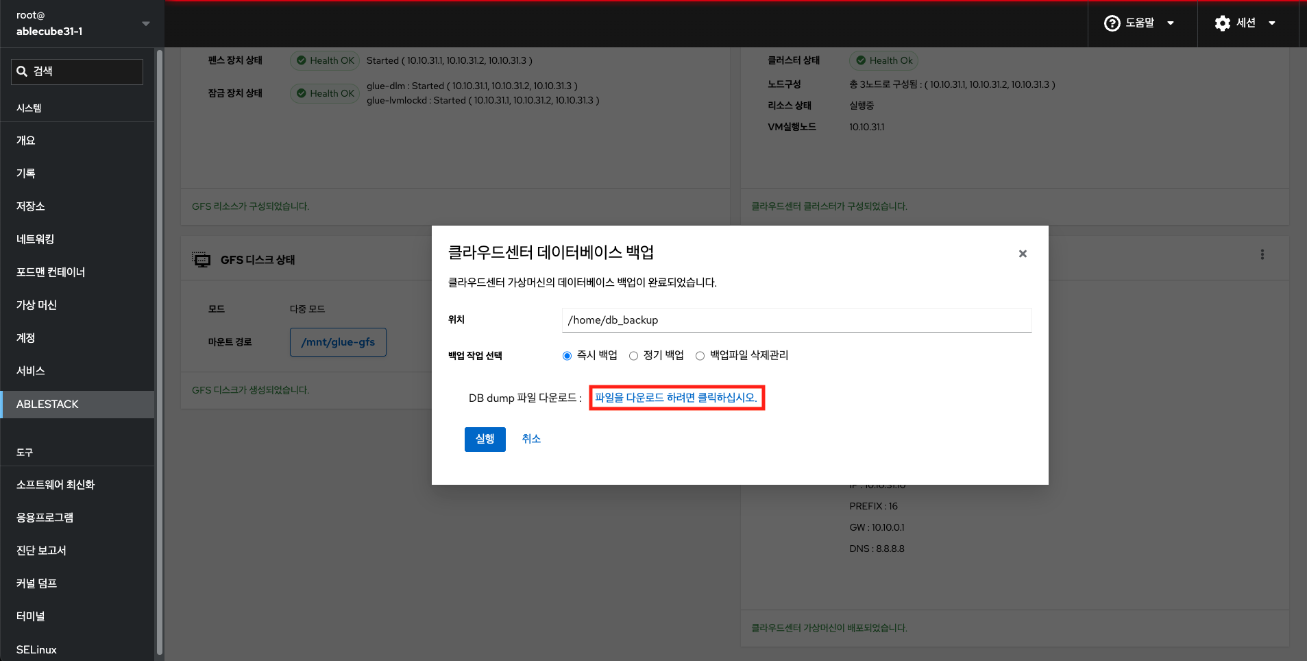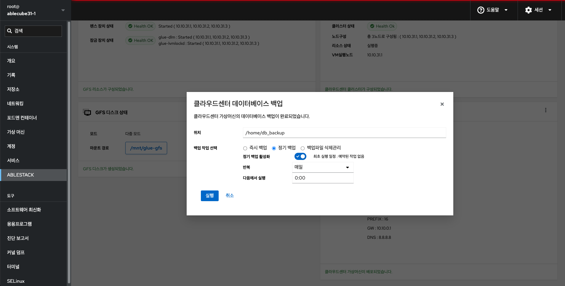 - 클라우드센터VM DB 백업 팝업을 호출합니다.