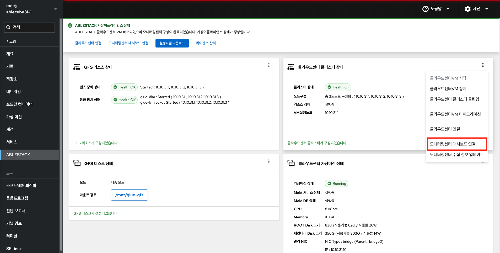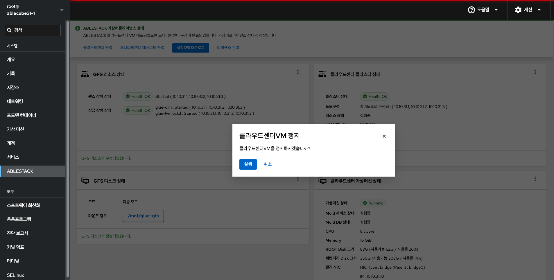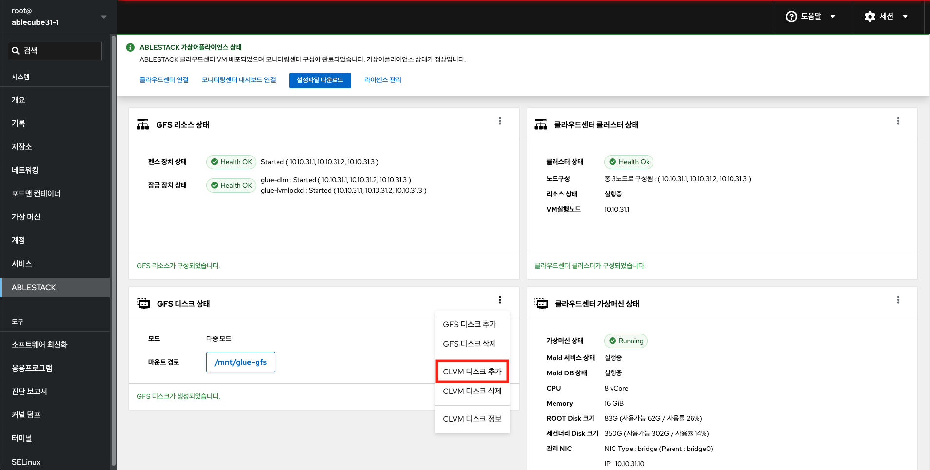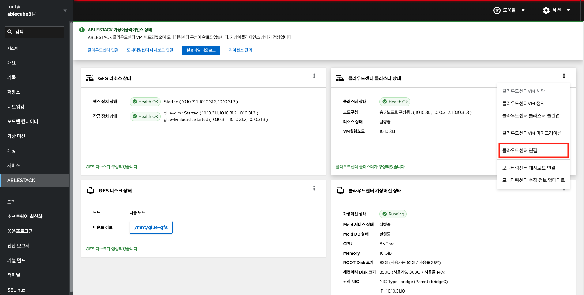 Cube 웹 콘솔의 ABLESTACK 메뉴에서는 가상화로 구성시 클라우스센터 가상머신 배포와 클러스터를 구성하고 ABLESTACK 가상어플라이언스 관리 및 상태 모니터링을 제공합니다.
