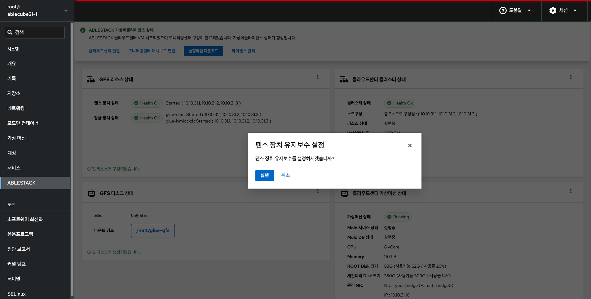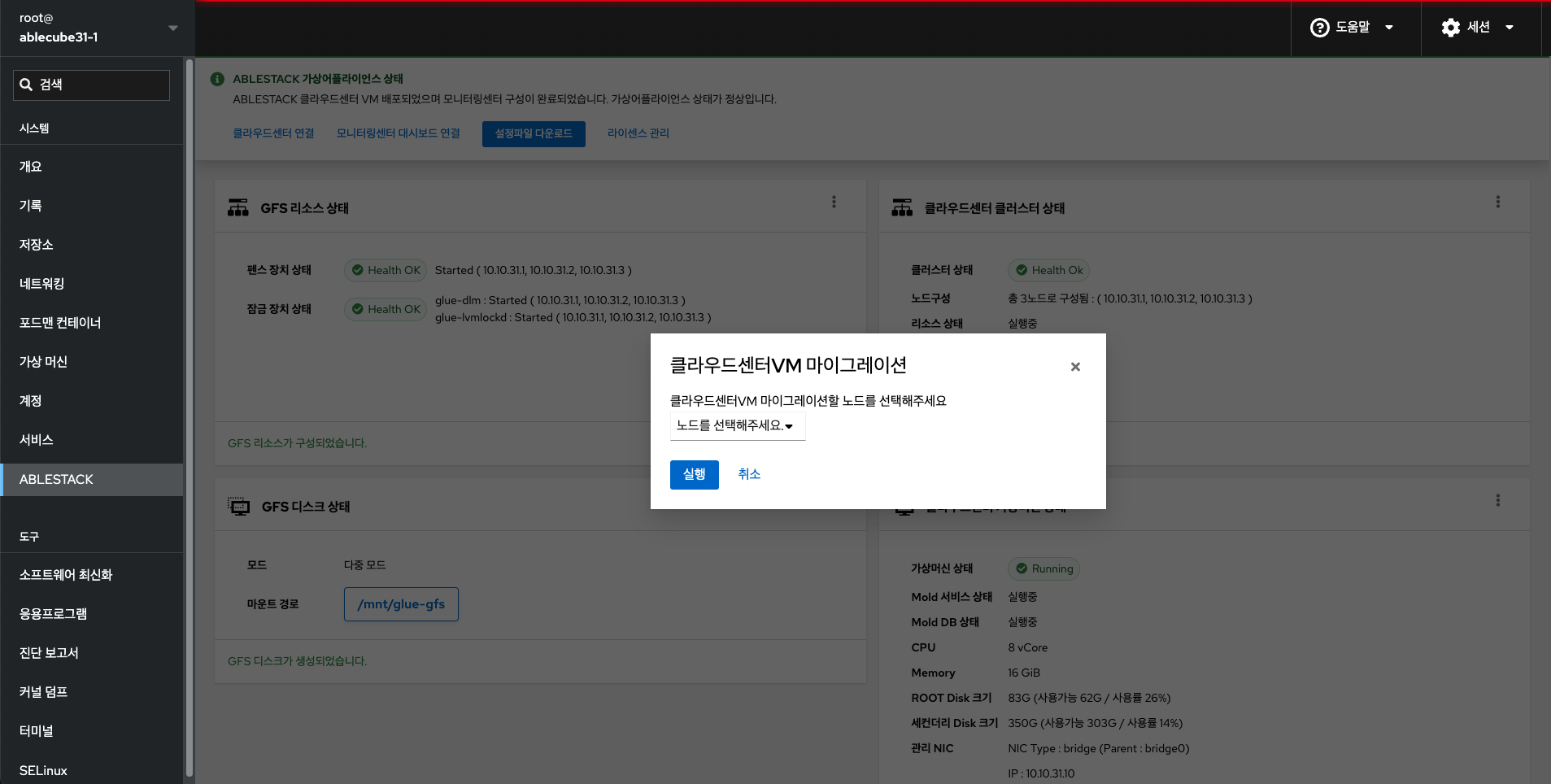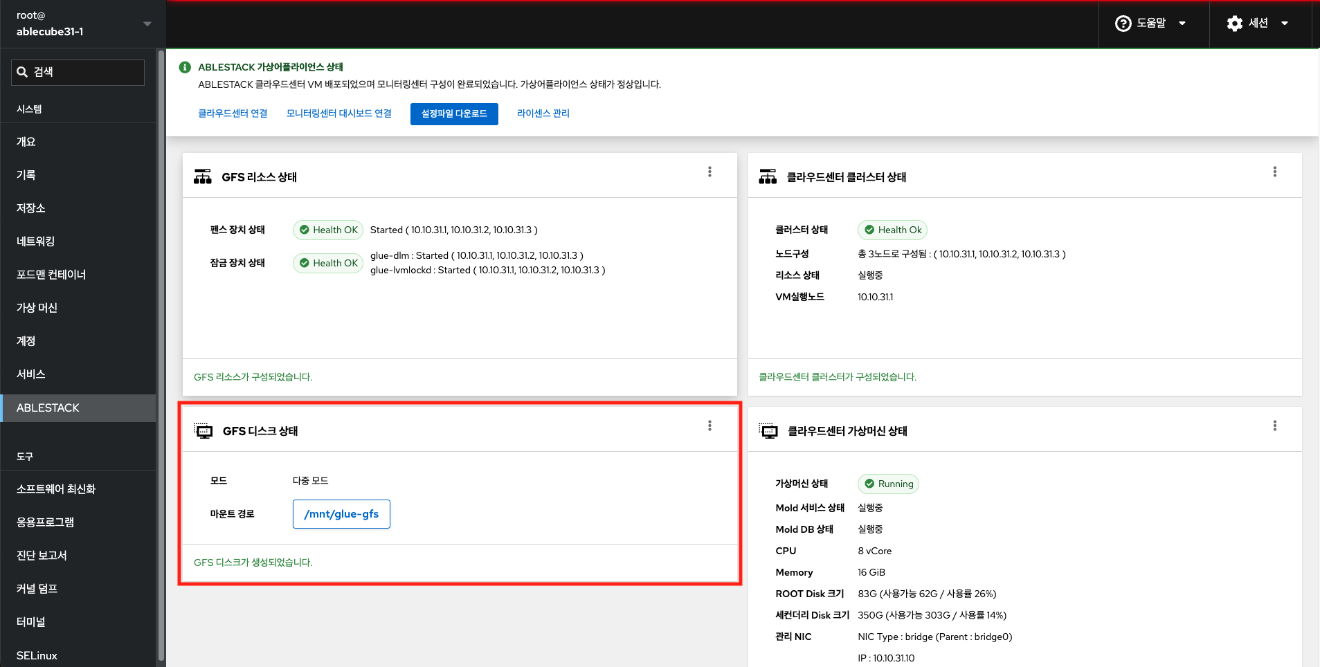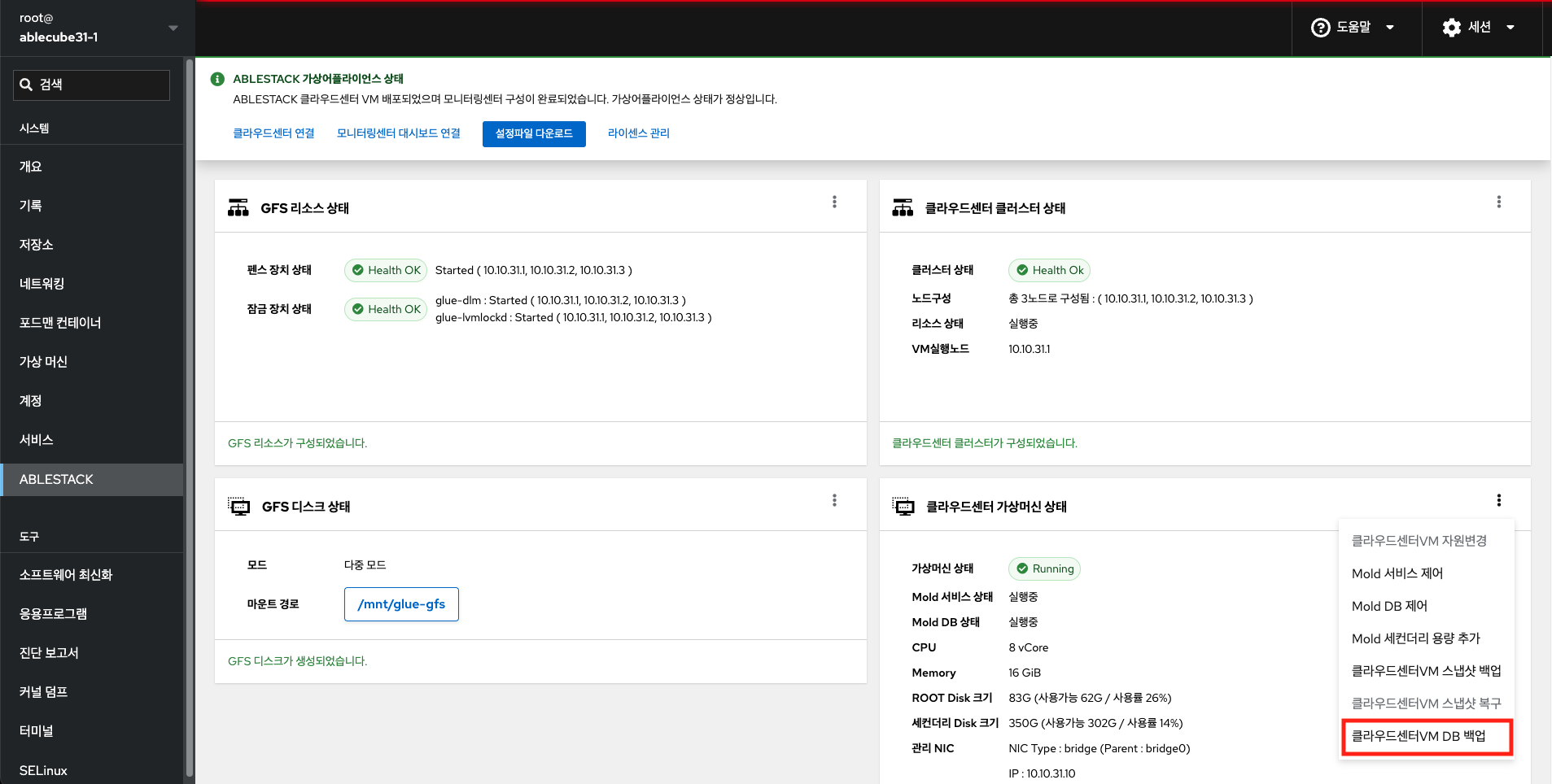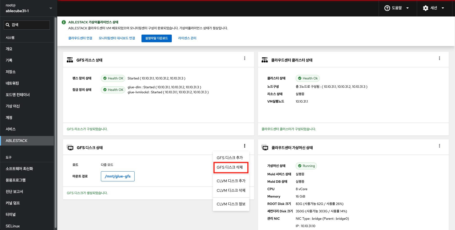 Cube 웹 콘솔의 ABLESTACK 메뉴에서는 가상화로 구성시 클라우스센터 가상머신 배포와 클러스터를 구성하고 ABLESTACK 가상어플라이언스 관리 및 상태 모니터링을 제공합니다.