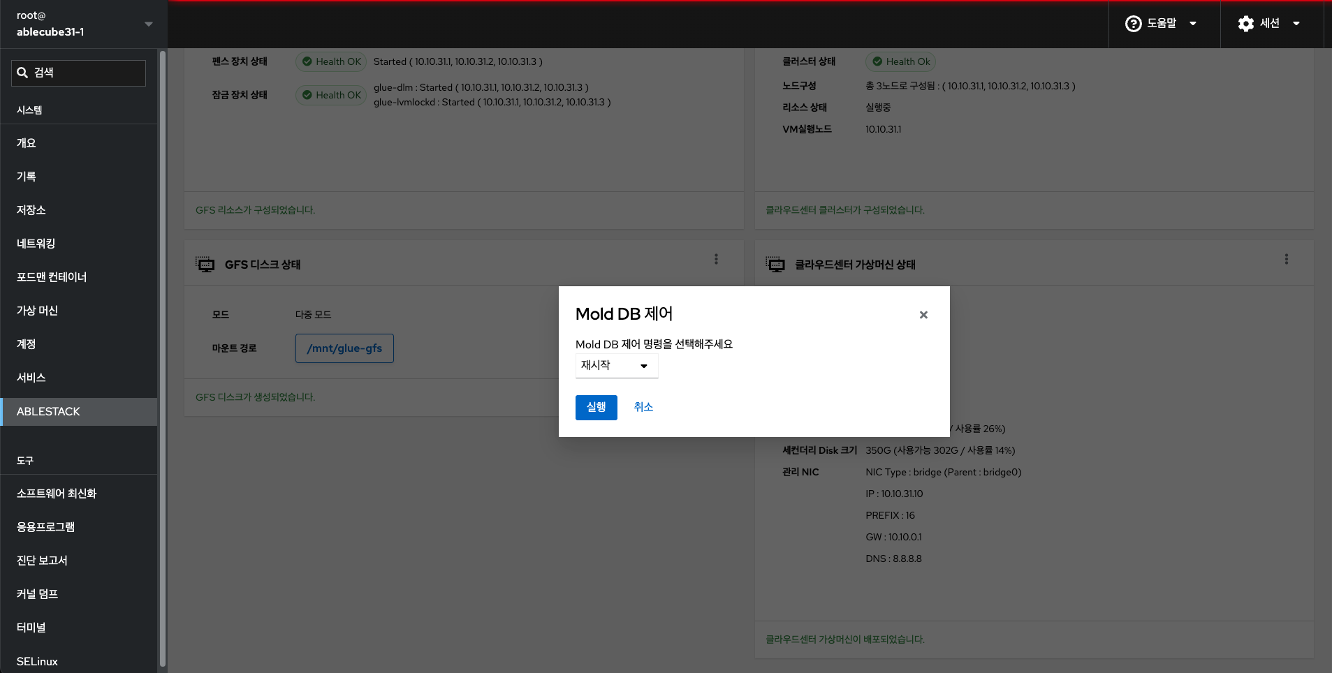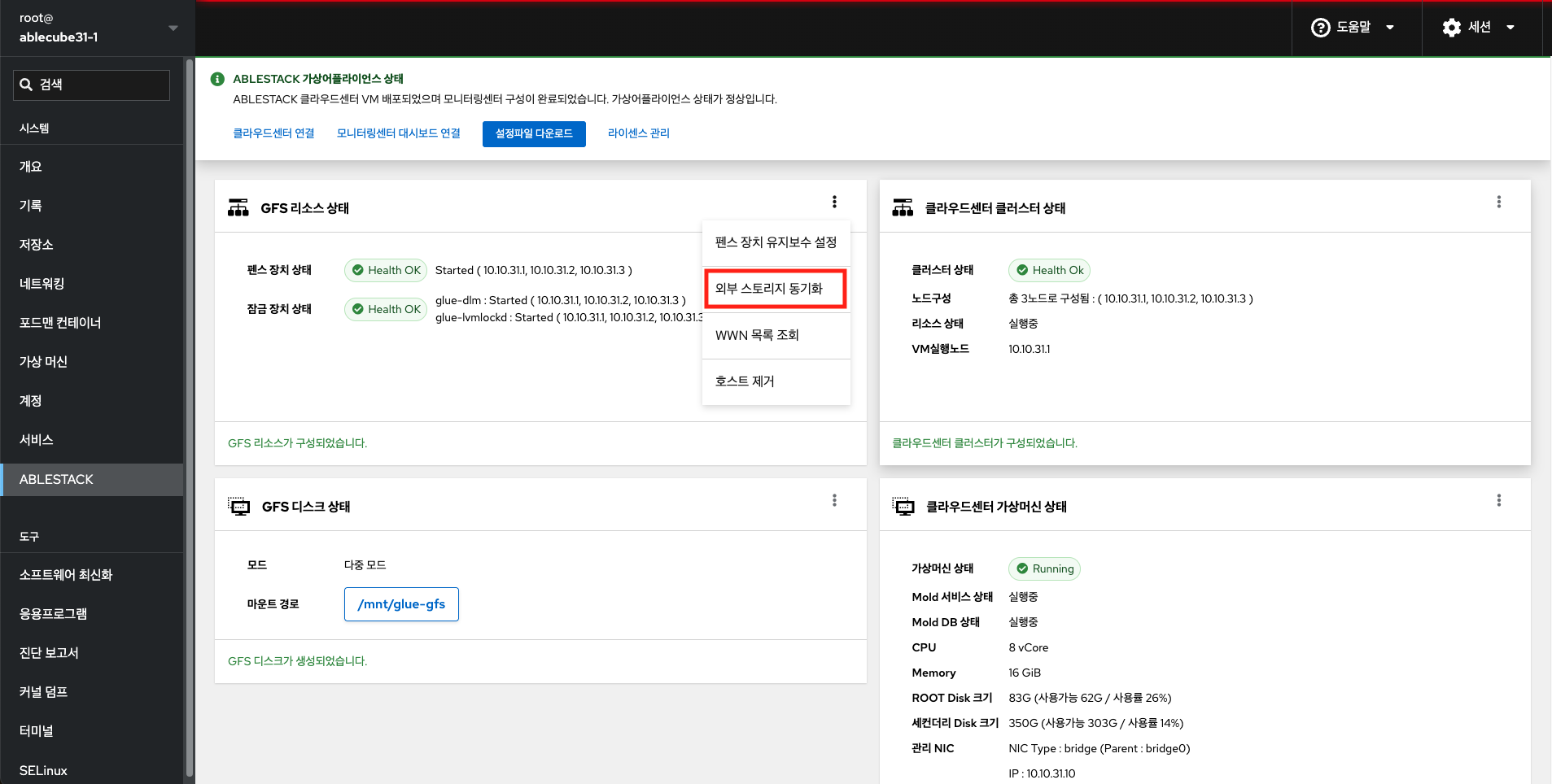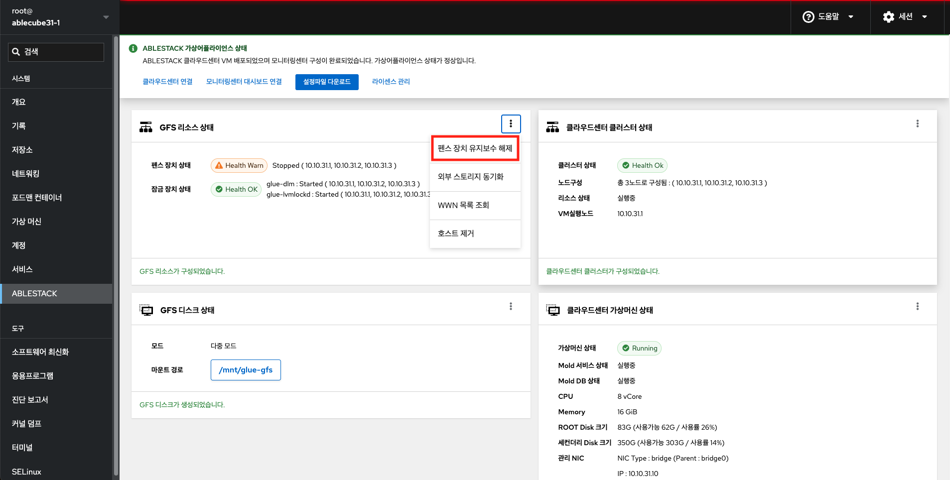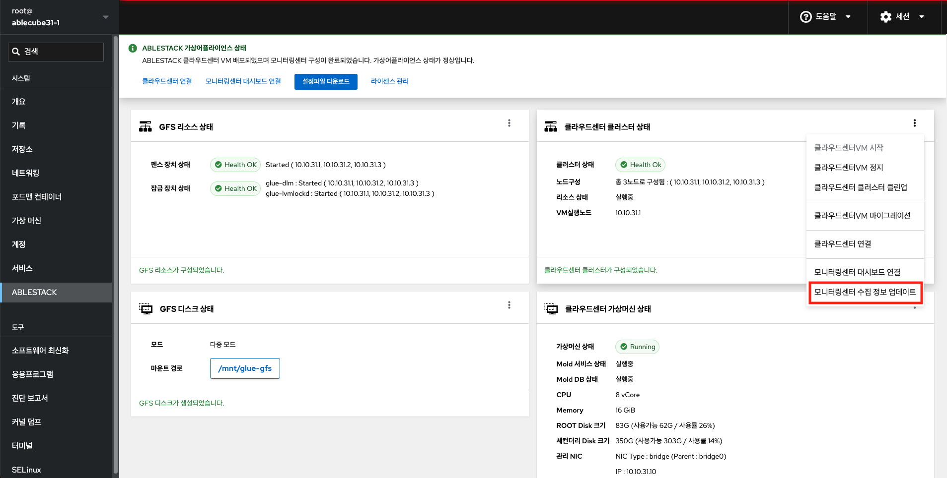 Cube 웹 콘솔의 ABLESTACK 메뉴에서는 가상화로 구성시 클라우스센터 가상머신 배포와 클러스터를 구성하고 ABLESTACK 가상어플라이언스 관리 및 상태 모니터링을 제공합니다.