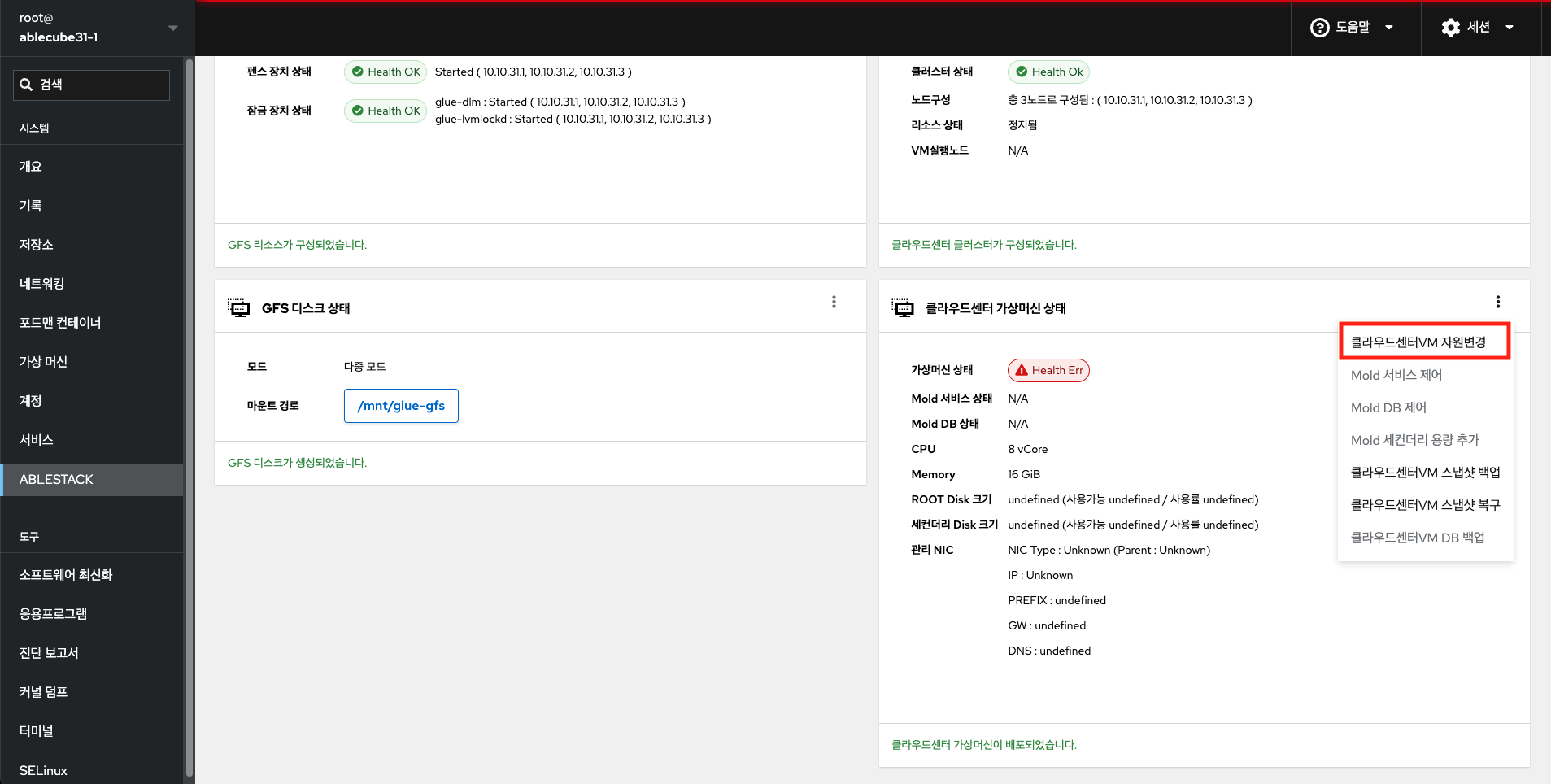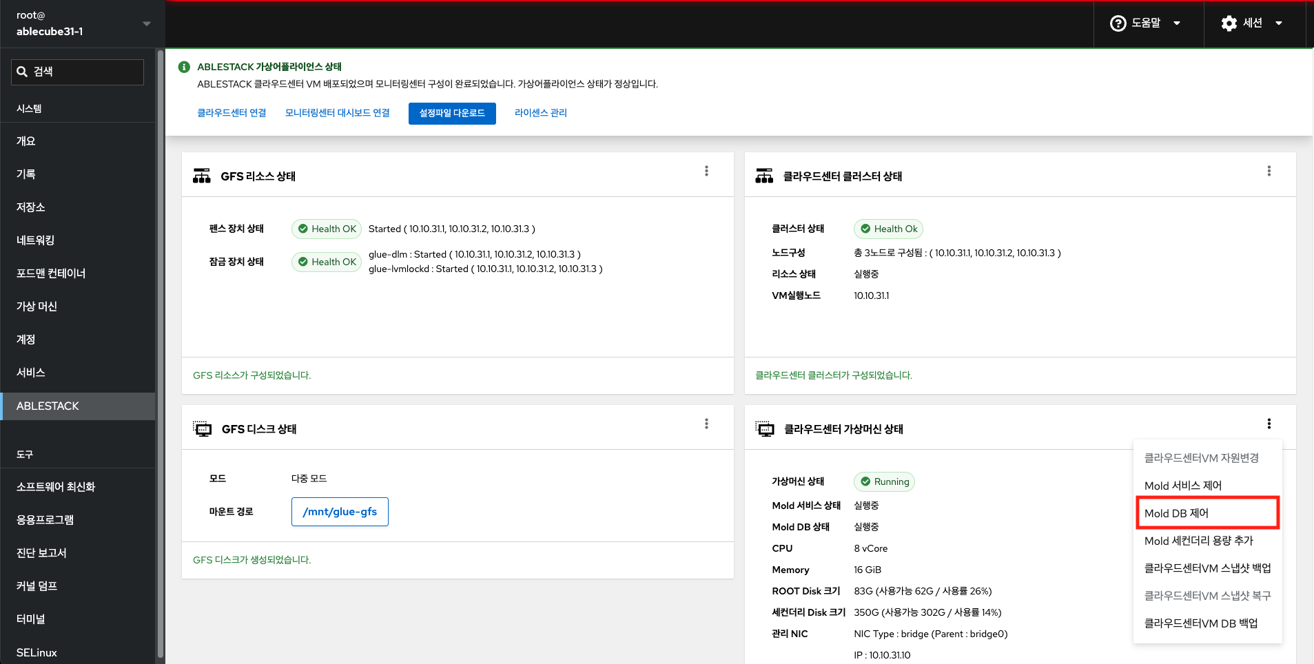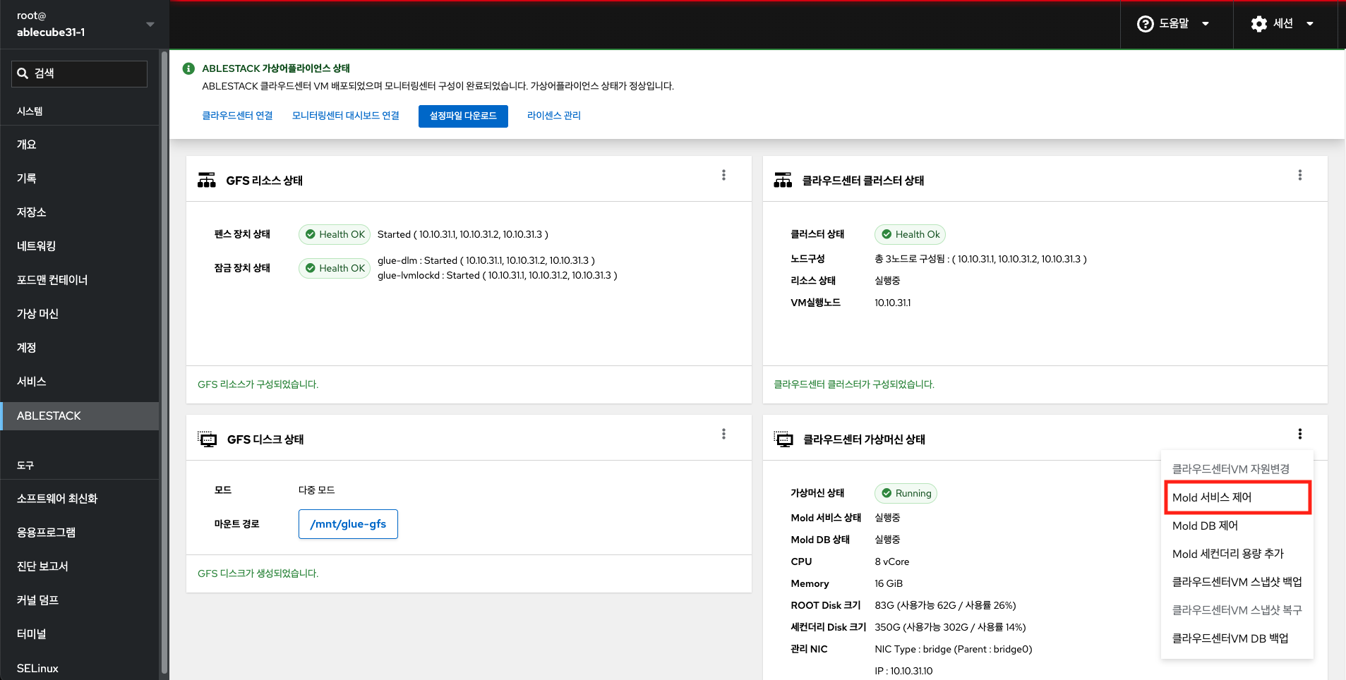 Mold(클라우드 관리) 제품의 클러스터 현재 상태와 Cloud Center VM이 실행중인 호스트를 확인 할 수 있습니다.