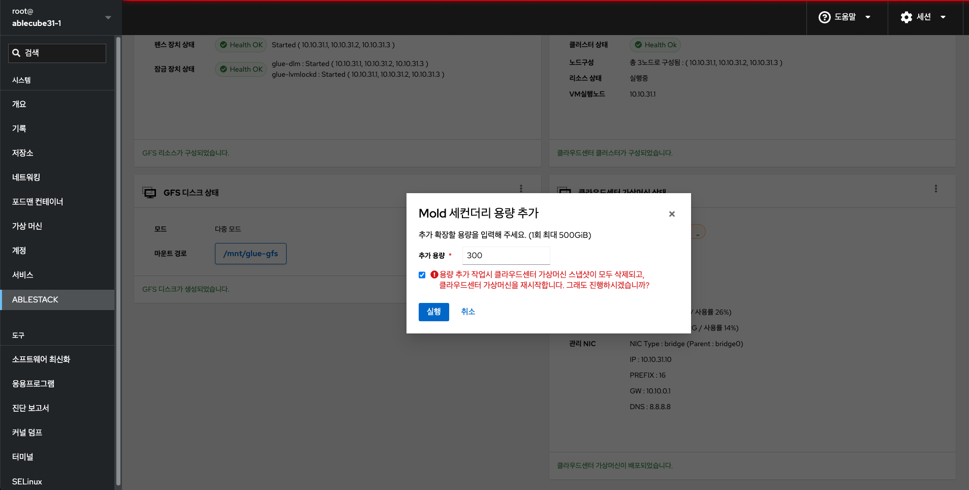용량 추가 작업시 클라우드센터 가상머신 스냅샷이 모두 삭제되고, 클라우드센터 가상머신을 재시작합니다