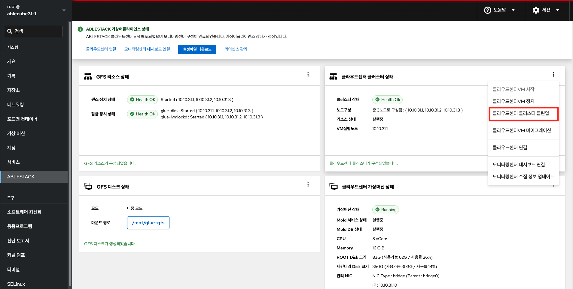 - 클라우드센터 클러스터 클린업 을 클릭합니다.