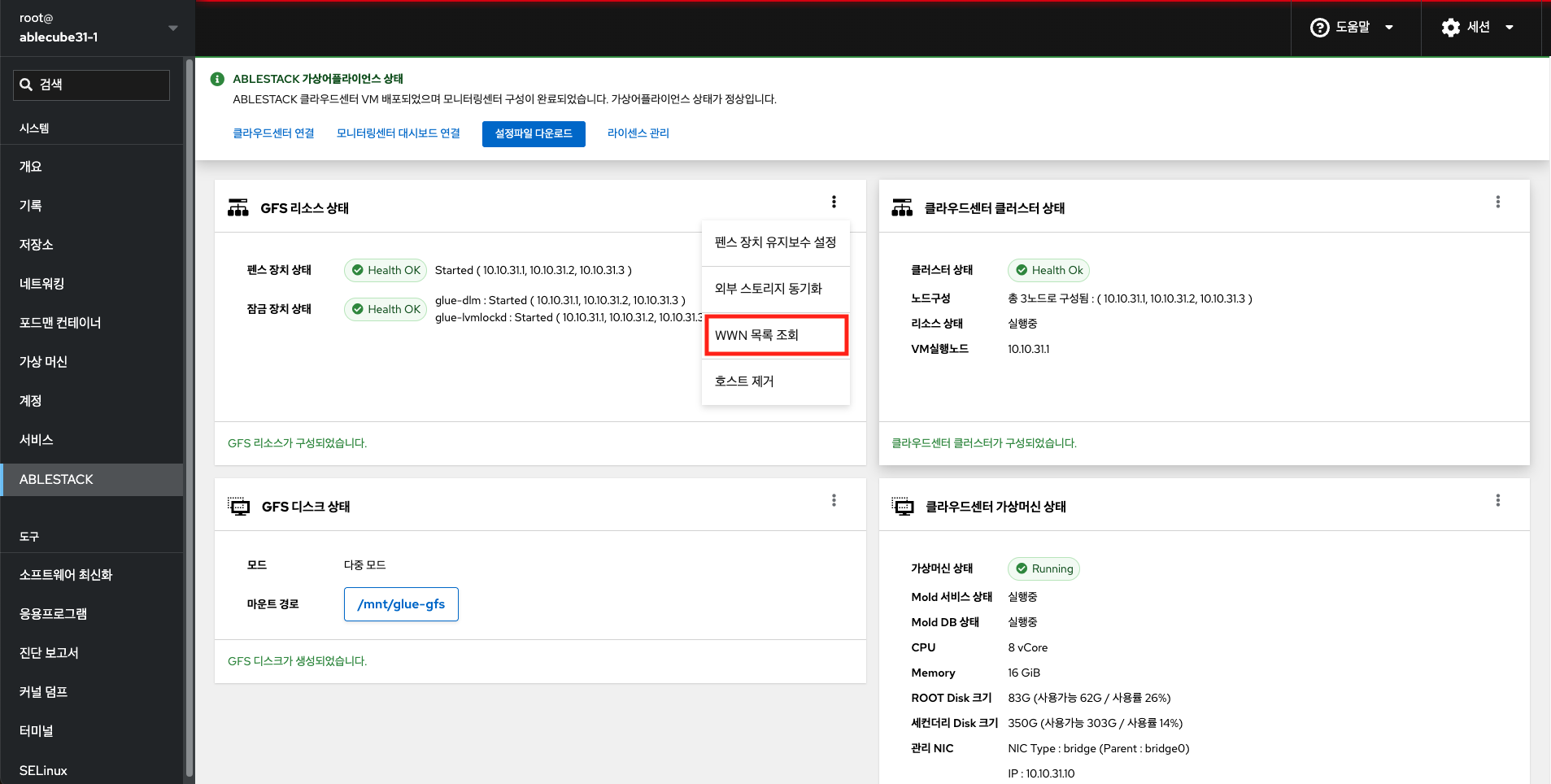 GFS 디스크의 현재 상태와 마운트 정보를 확인할 수 있습니다. GFS 및 CLVM 디스크를 관리할 수 있습니다.