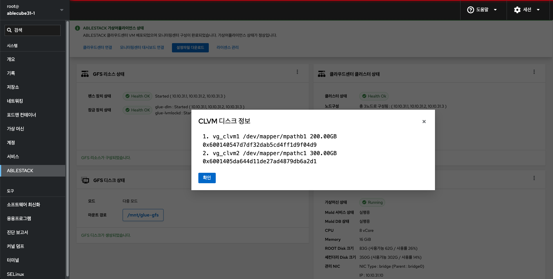 - 확인 버튼을 클릭하여 CLVM 디스크 정보 팝업을 닫습니다.