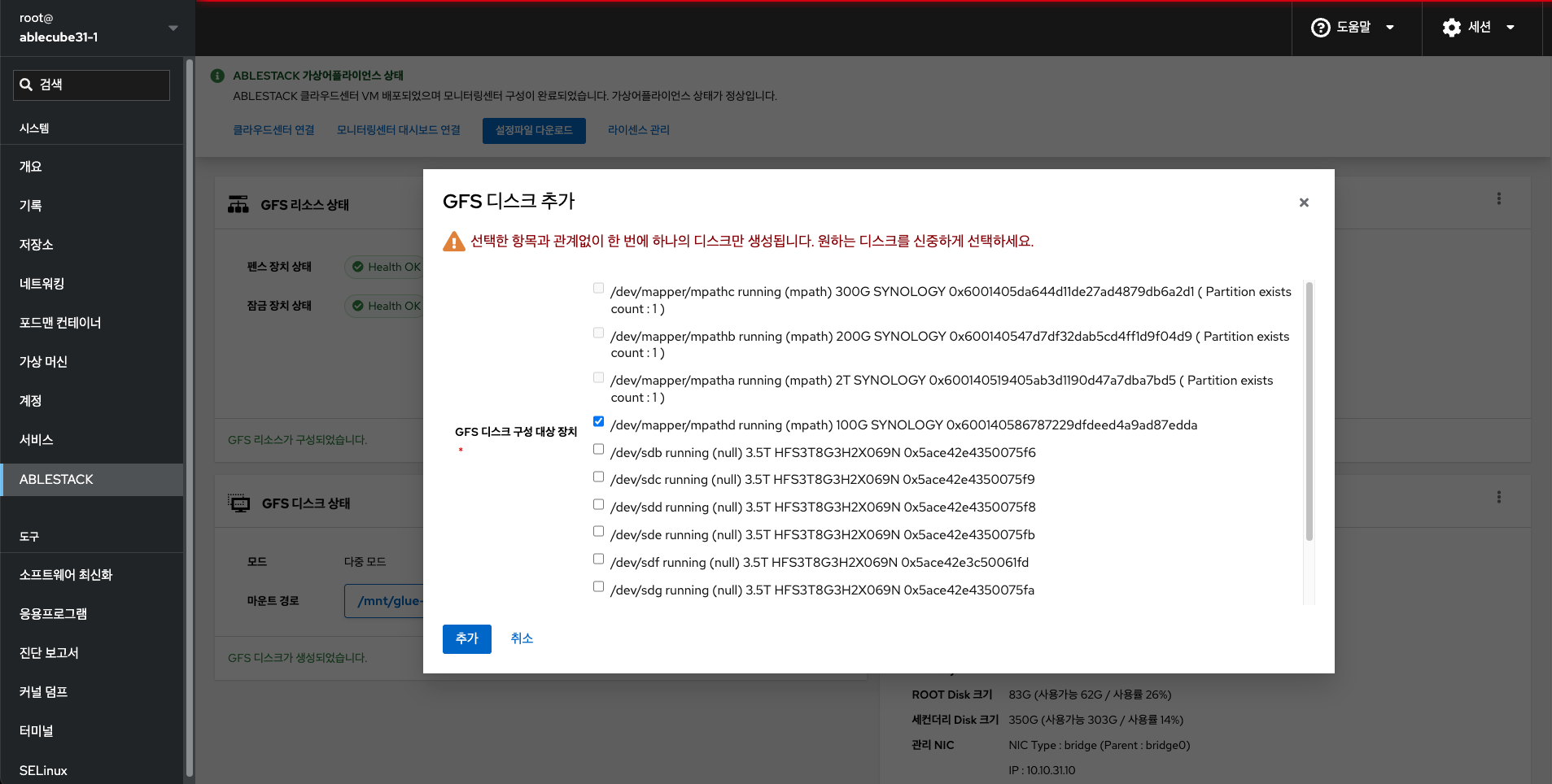 GFS 디스크를 추가하려면, 사용되는 디스크를 연결이 선행되어야 합니다. wwn으로 해당 디스크를 찾아 선택하시면 됩니다.