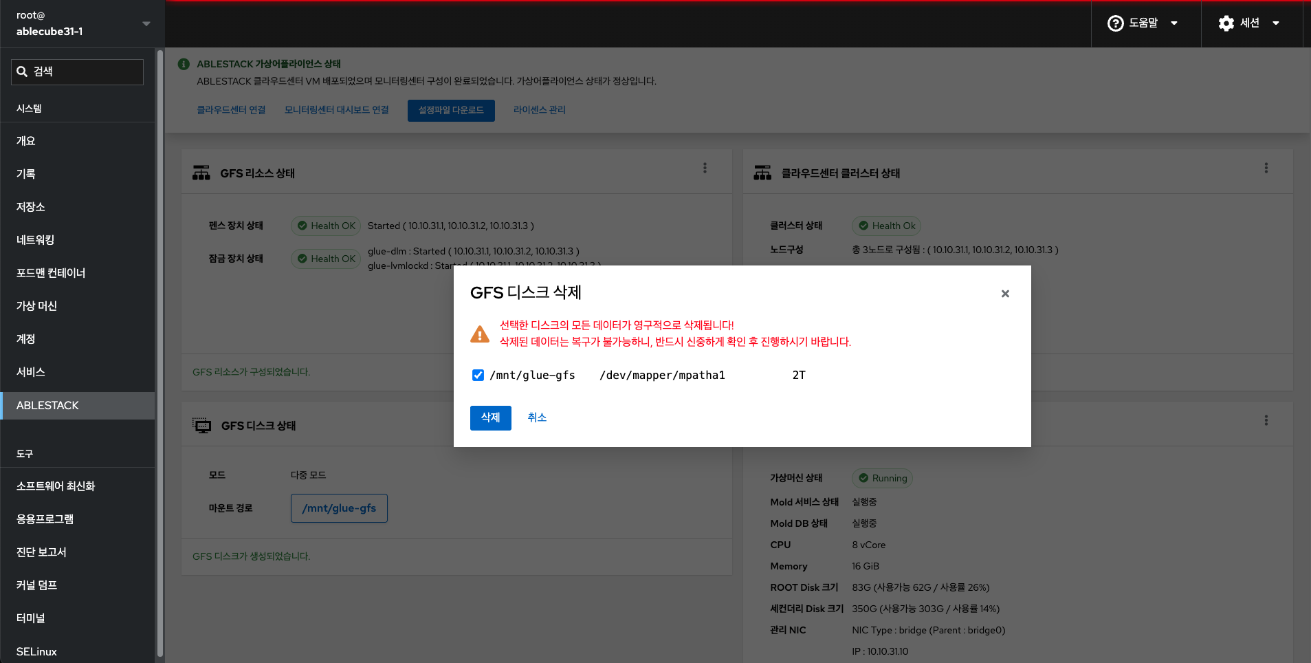 - GFS 디스크 삭제 팝업을 호출합니다.