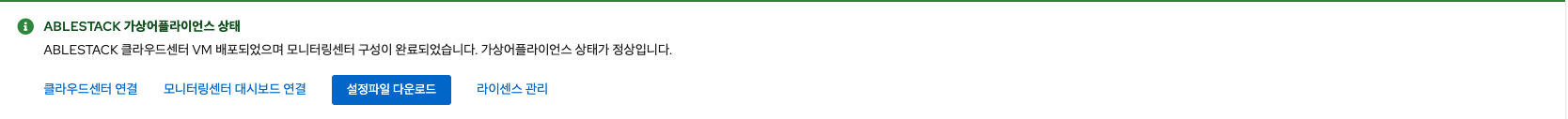 클라우스센터 가상머신의 배포 및 클러스터 구성 여부에 따라 현 상태를 메시지로 표현합니다. 각 단계별 수행해야 되는 필수 구성 정보를 확인하여 설치 마법사 및 대시보드 링크를 제공하며 ABLESTACK 가상 어플라이언스 구성에 편의를 제공합니다.