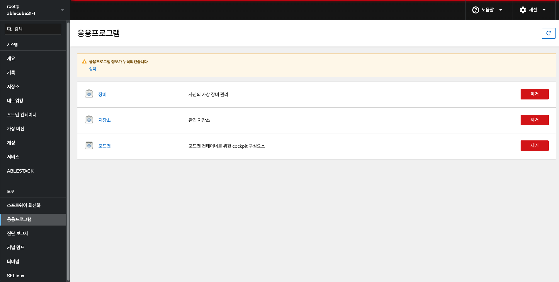 | Storage | cockpit-storaged | 스토리지 관리 (기본적으로 설치됨) |