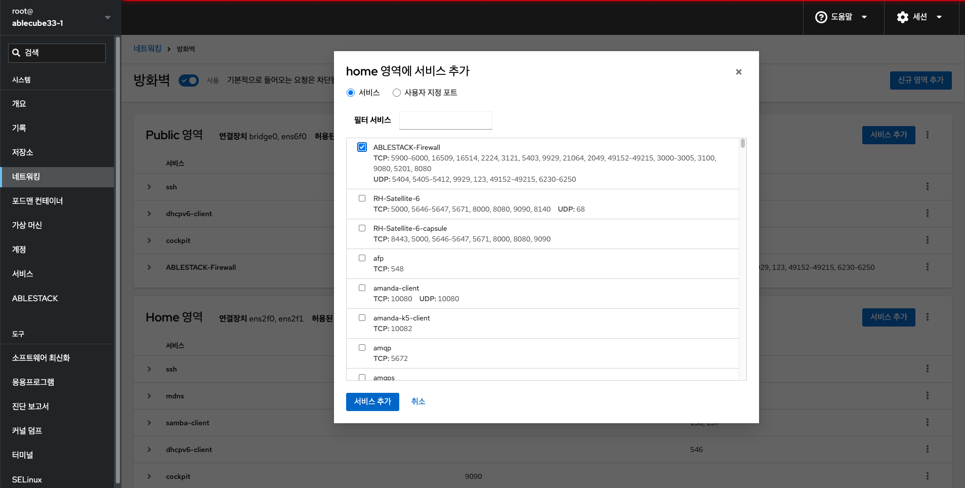 - 서비스 추가 화면에서 방화벽에 사용하려는 서비스를 찾을 수 있습니다.