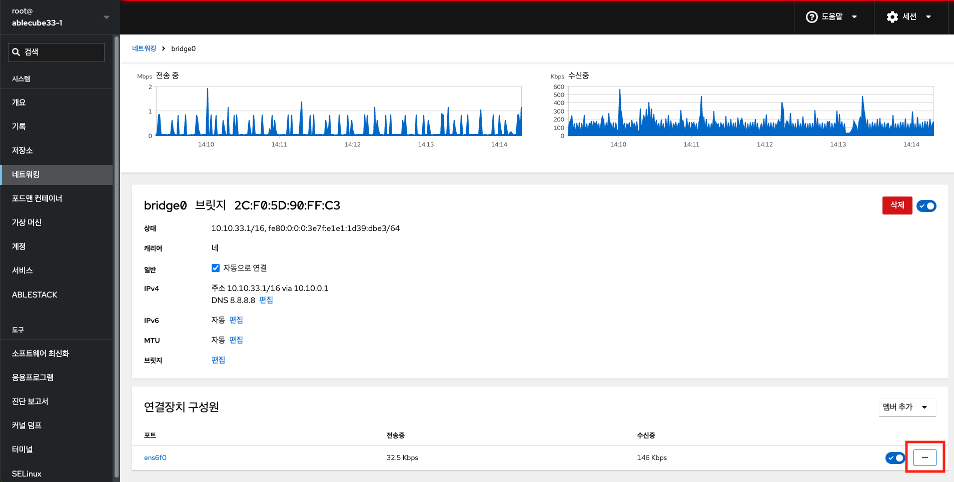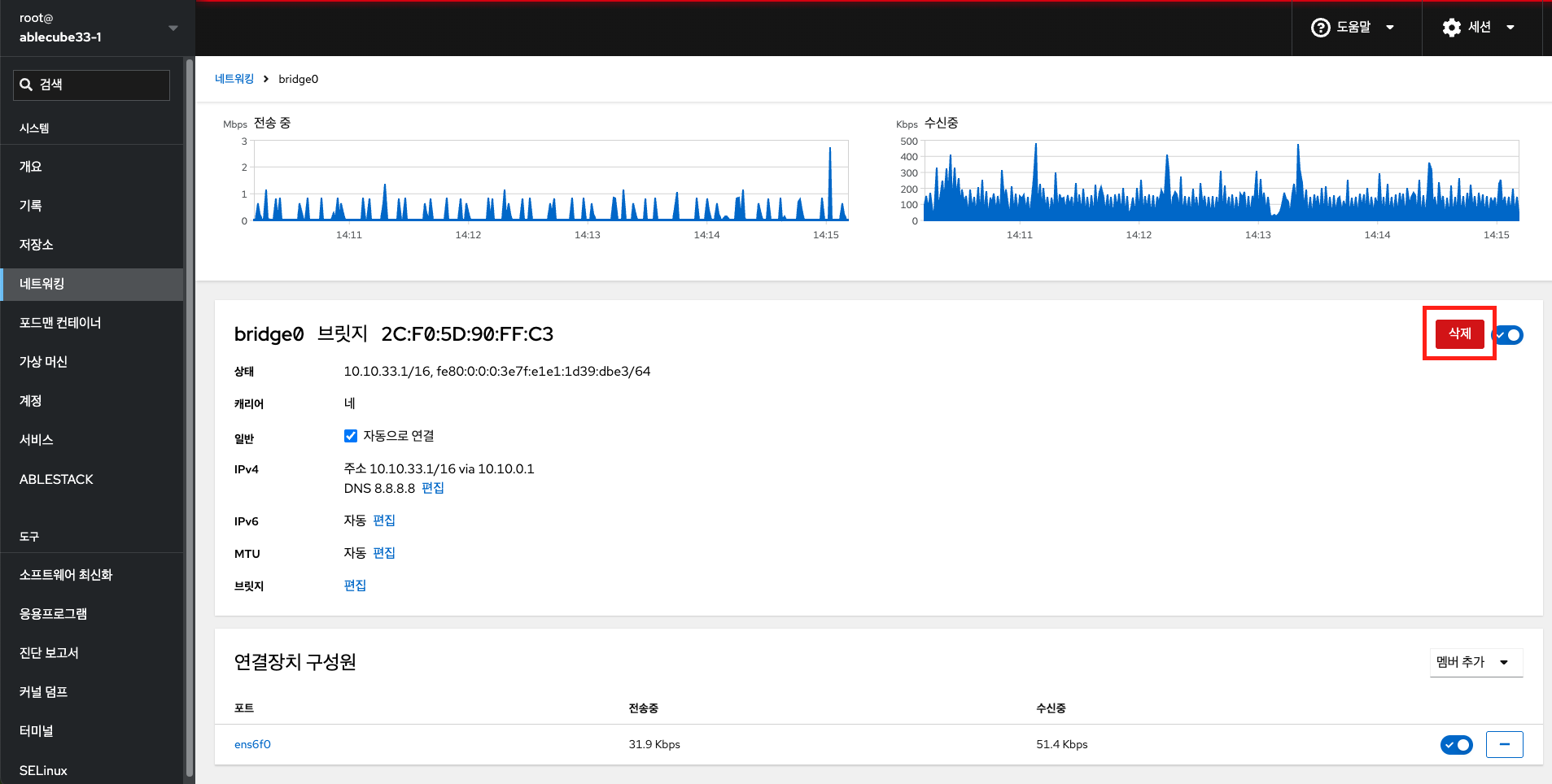 Cube의 웹 콘솔을 사용하여 네트워크 본드를 제거하거나 비활성화합니다. 본드를 비활성화하면 인터페이스는 본드에 남아있지만 본드는 네트워크 트래픽에 사용되지 않습니다.