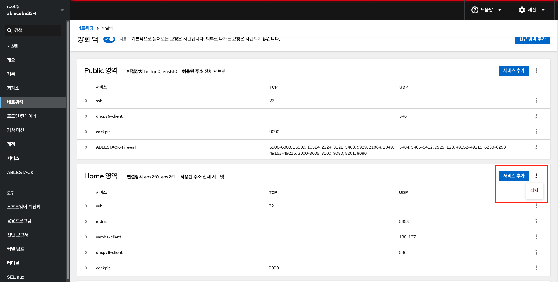 Cube의 웹 콘솔을 사용하여 방화벽 구성에서 방화벽 영역을 비활성화합니다.