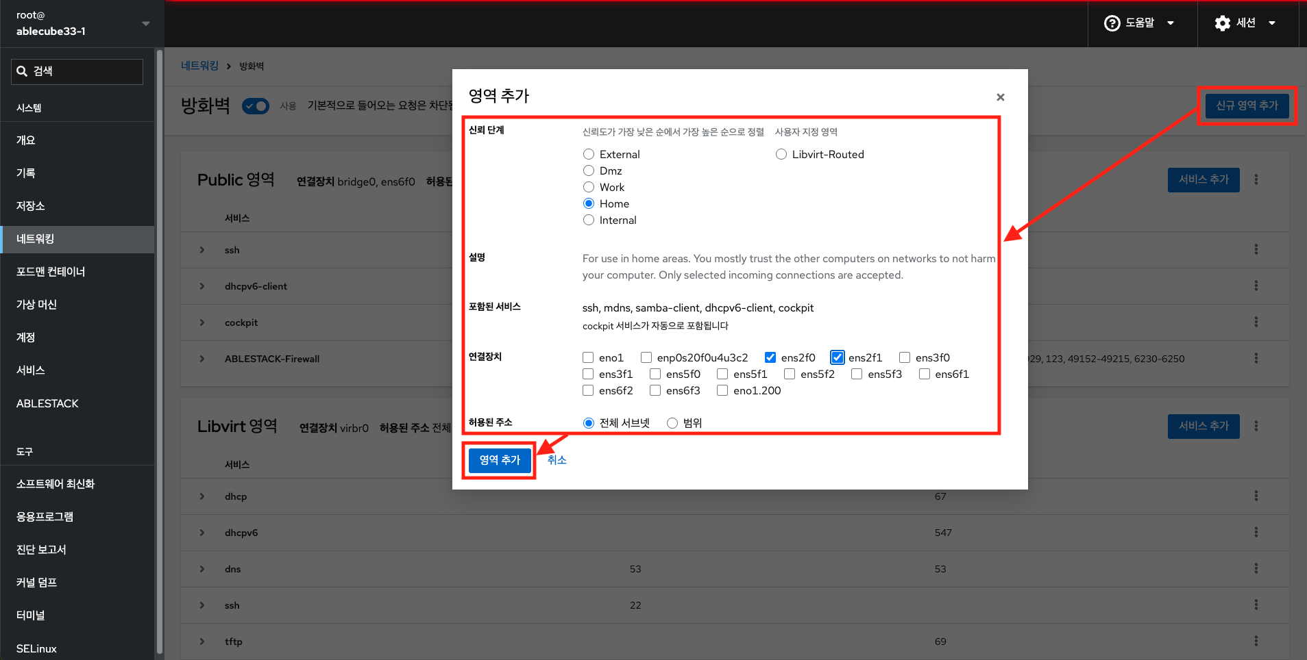 Cube의 웹 콘솔을 사용하면 특정 인터페이스 또는 IP 주소 범위에 미리 정의된 기존 방화벽 영역을 적용할 수 있습니다.