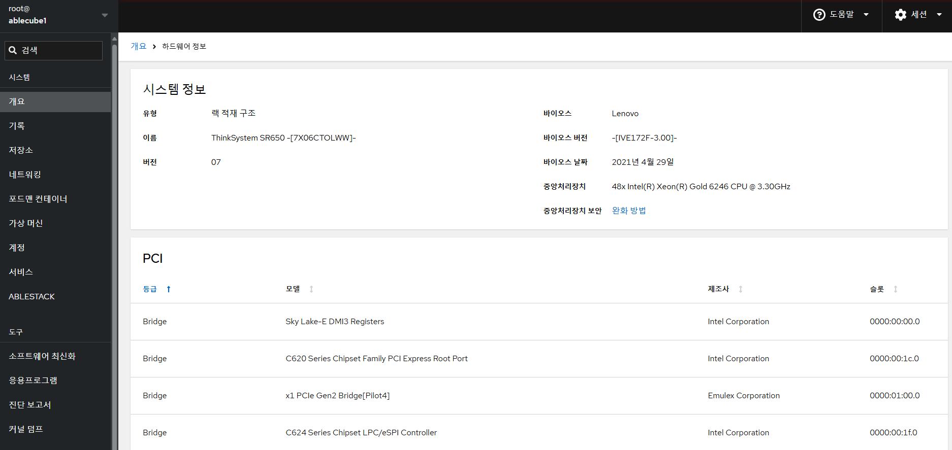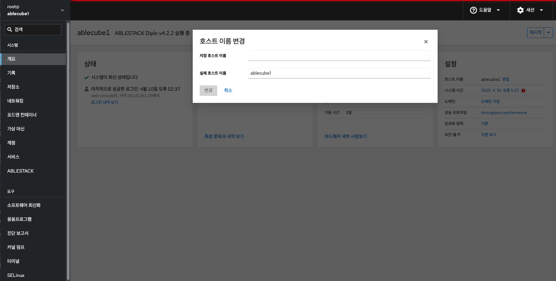 Cube 웹 콘솔은 로컬 시스템과 네트워크 환경에서 ABLESTACK 스토리지센터 및 클라우드센터 가상머신의 배포와 클러스터 관리를 위한 웹 기반 인터페이스입니다. 이를 통해 사용자는 시스템, 네트워크, 저장소 관리와 ABLESTACK 설치 마법사 및 제품 구성 요소 관리를 효율적으로 수행할 수 있습니다.