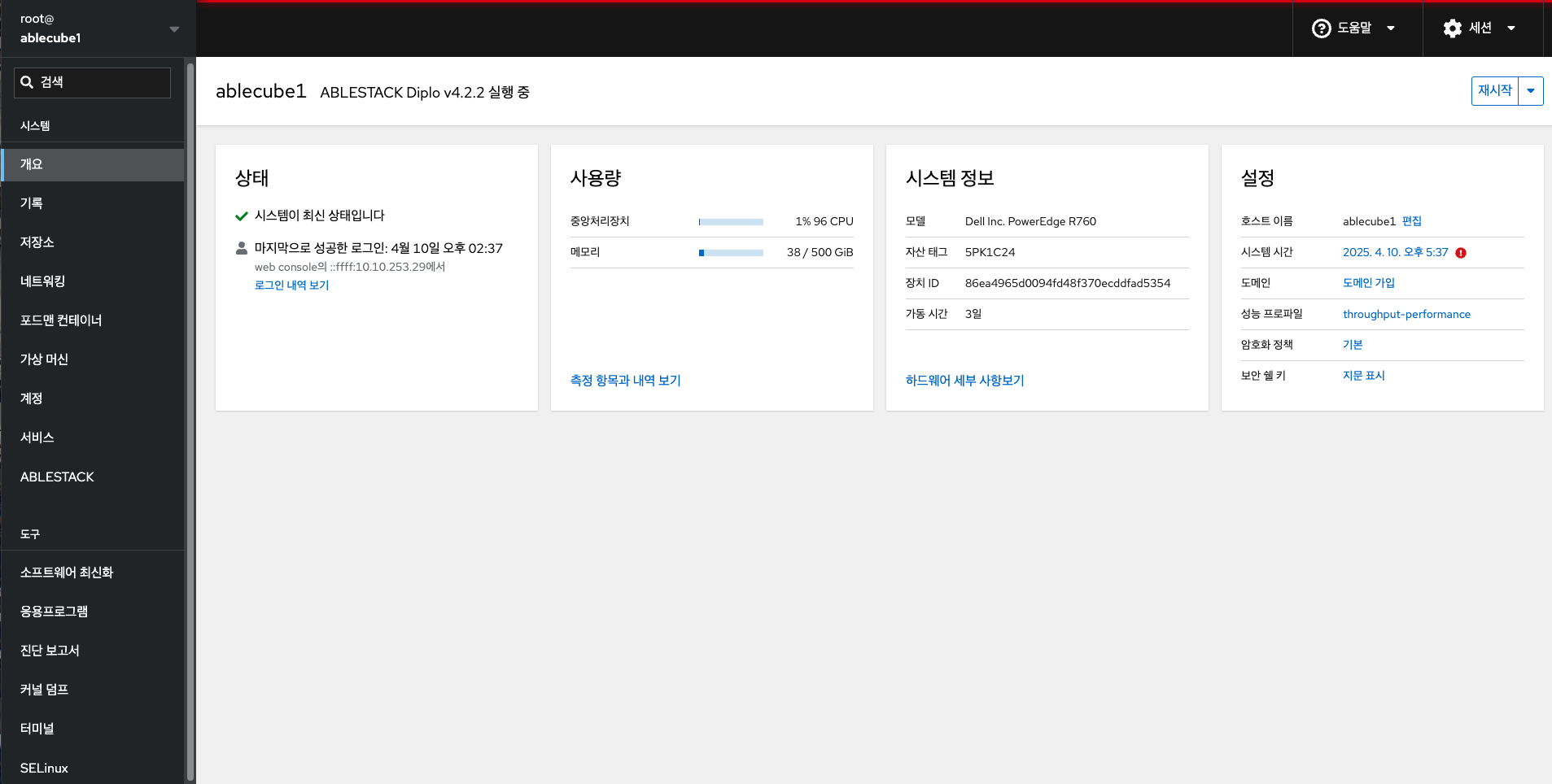 - Cube 대시보드는 관리자가 호스트의 정보를 한눈에 확인할 수 있도록 서비스의 상태, 자원 사용량, 시스템 정보, 설정 정보 등의 다양한 정보를의 제공하는 대시보드입니다. 이를 통해 운영자는 호스트의 전반적인 상태를 확인할 수 있습니다.