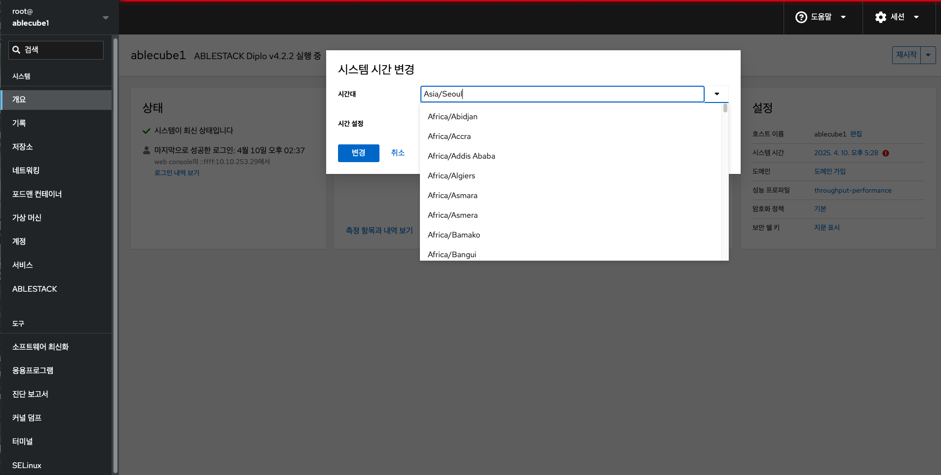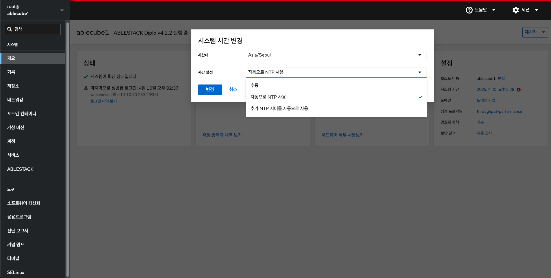 시간대를 설정하고 시스템 시간을 NTP(Network Time Protocol) 서버와 동기화 할 수 있습니다.