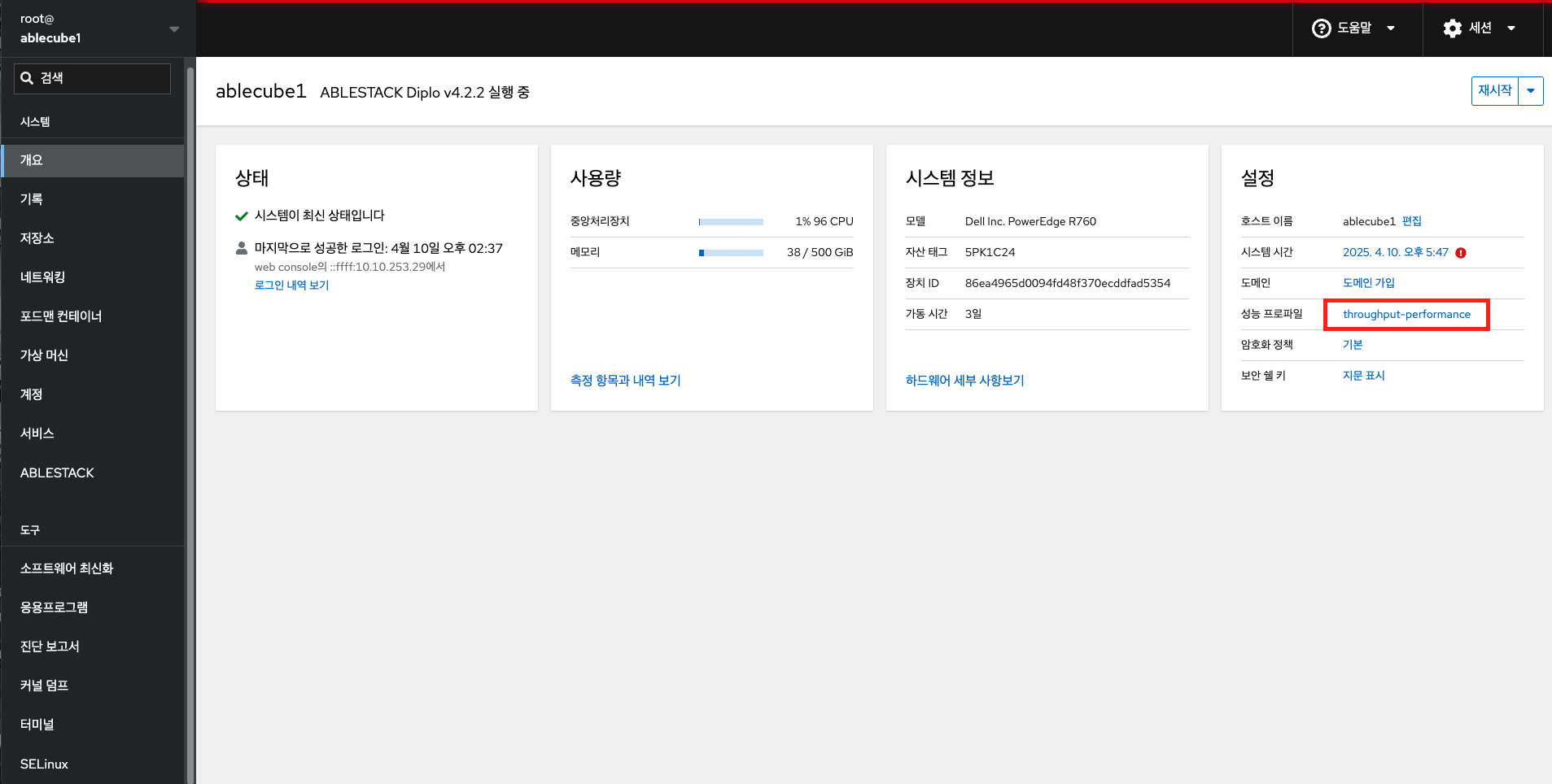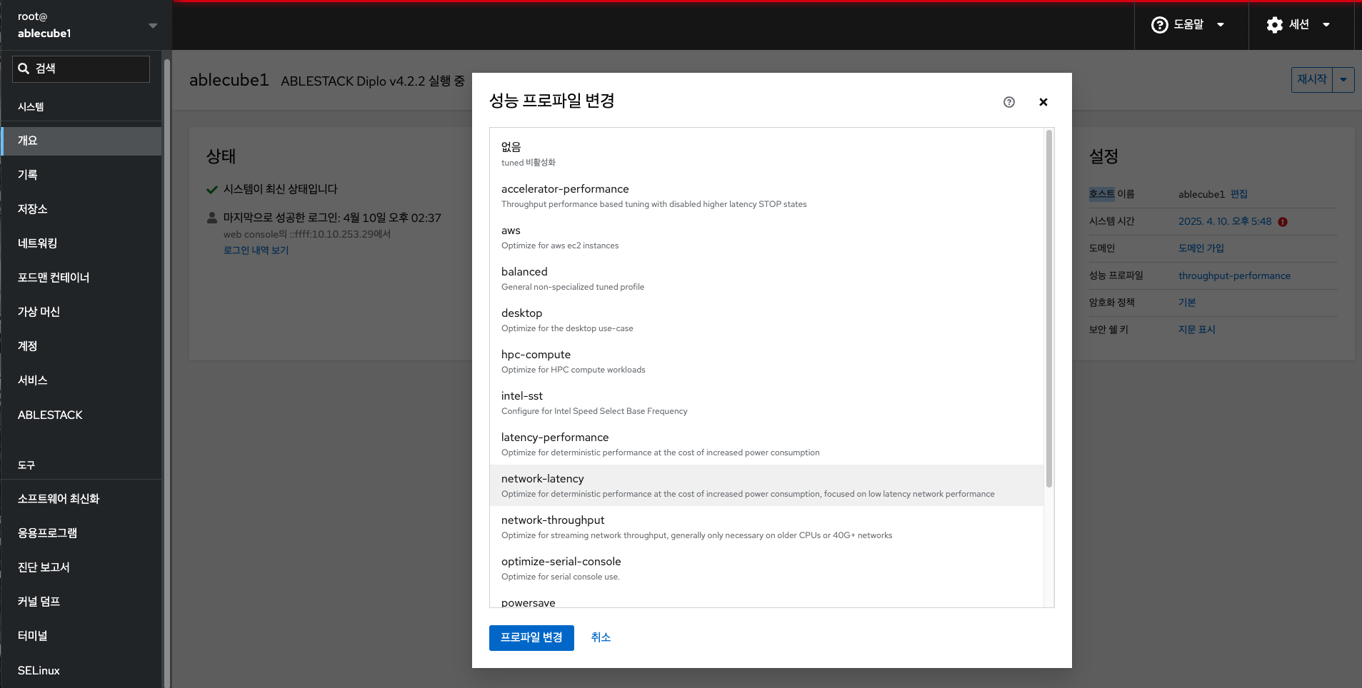 - 시스템 성능 최적화 하려면 **성능 프로파일**의 현재 정보를 클릭합니다.