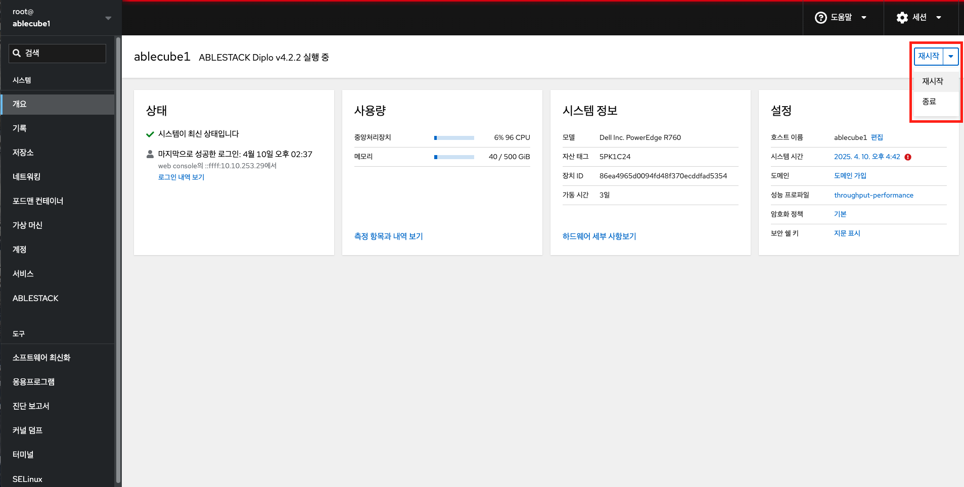 Cube 웹 콘솔을 사용하여 연결된 시스템을 다시 시작할 수 있습니다.