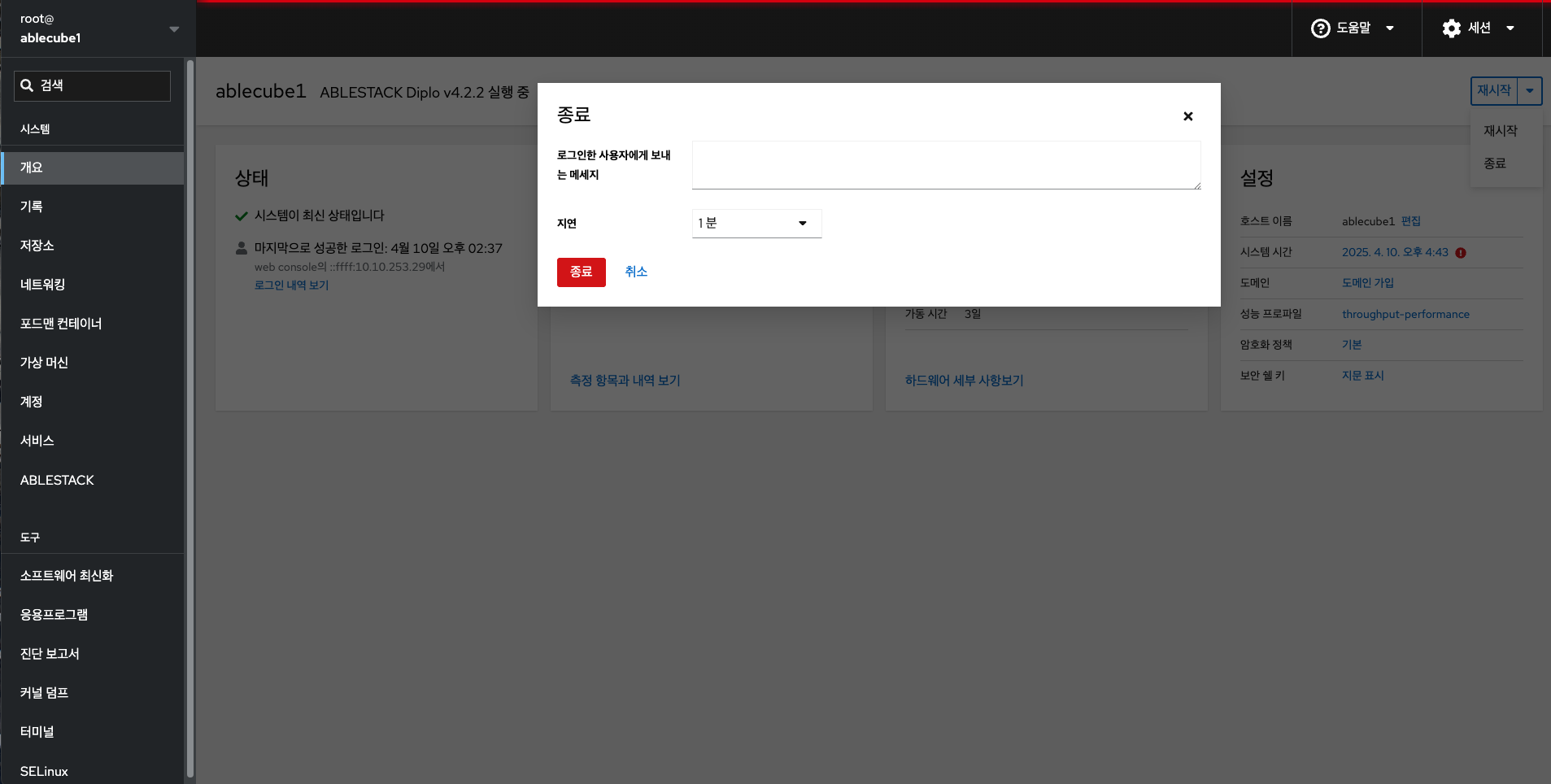 Cube 웹 콘솔을 사용하여 연결된 시스템을 종료 할 수 있습니다.