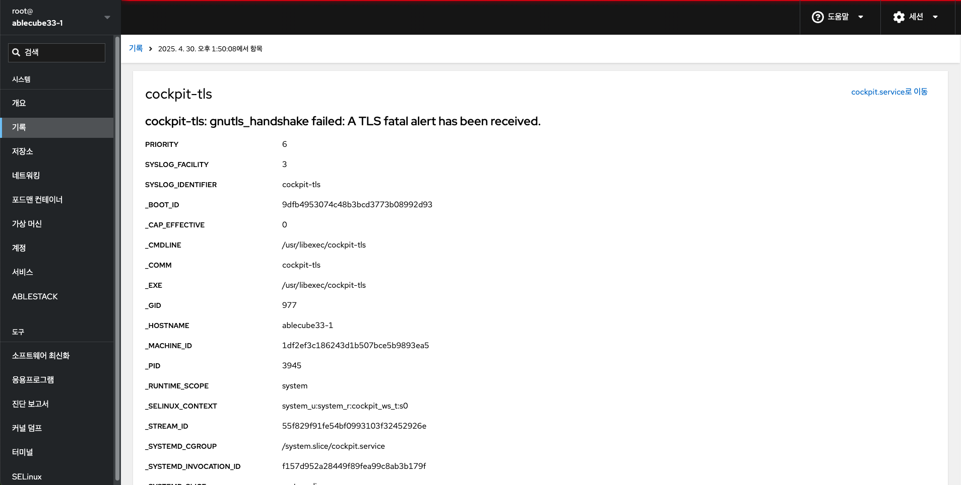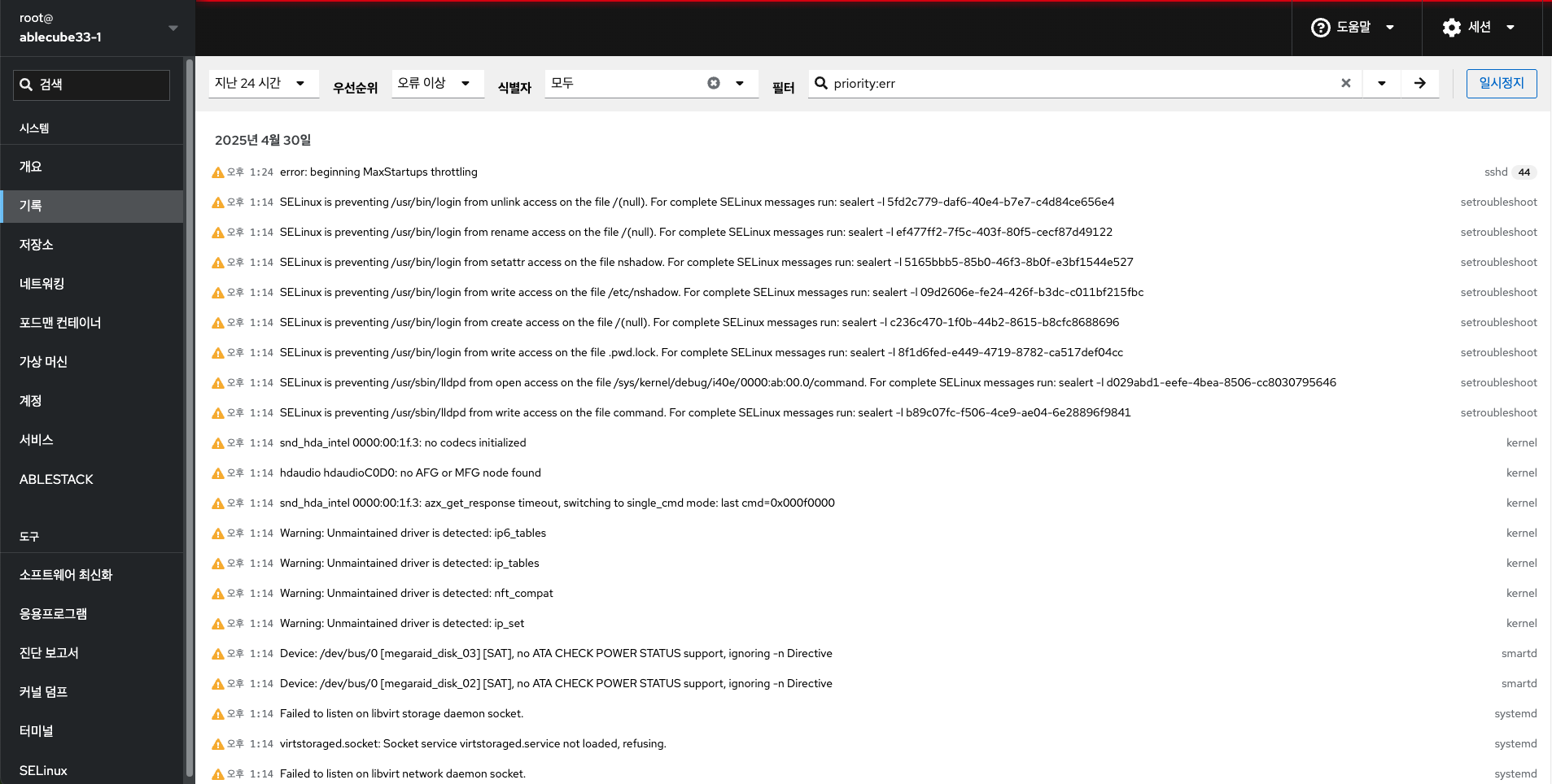 | identifier | 지정된 syslog 식별자 SYSLOG_IDENTIFIER에 대한 메시지를 표시합니다. 여러번 지정할 수 있습니다. (식별자 드롭다운 메뉴에 포함되어 있습니다.) |