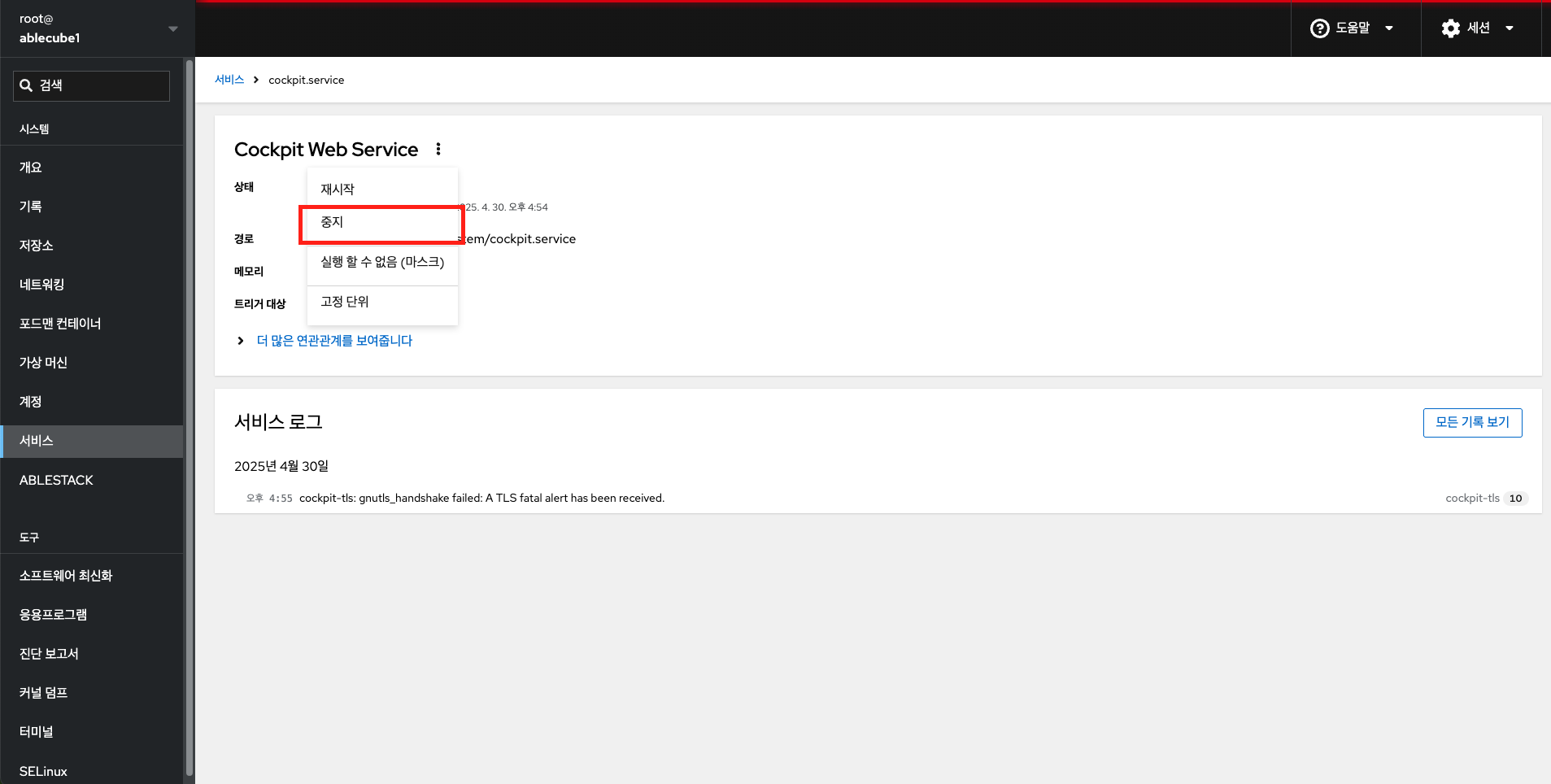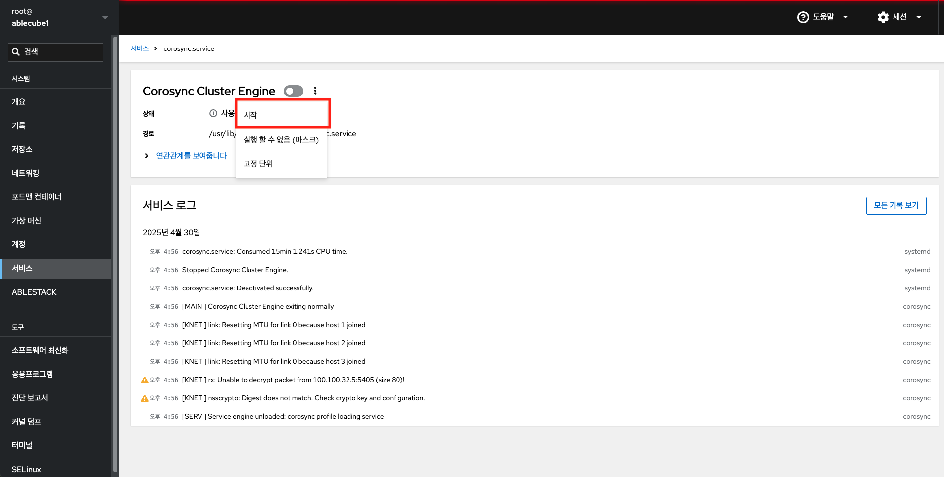 Cube의 웹 콘솔에서 시스템 서비스를 관리하는 기능을 제공합니다. 서비스를 활성화 또는 비활성화하고 다시 시작하거나 다시 로드하거나 자동 시작을 관리할 수 있습니다.