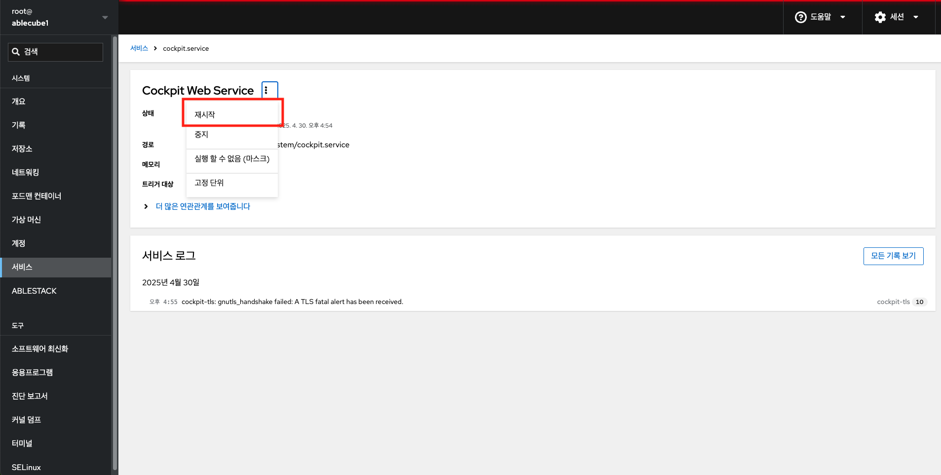 Cube의 웹 콘솔을 사용하여 시스템 서비스를 재시작 할 수 있습니다.