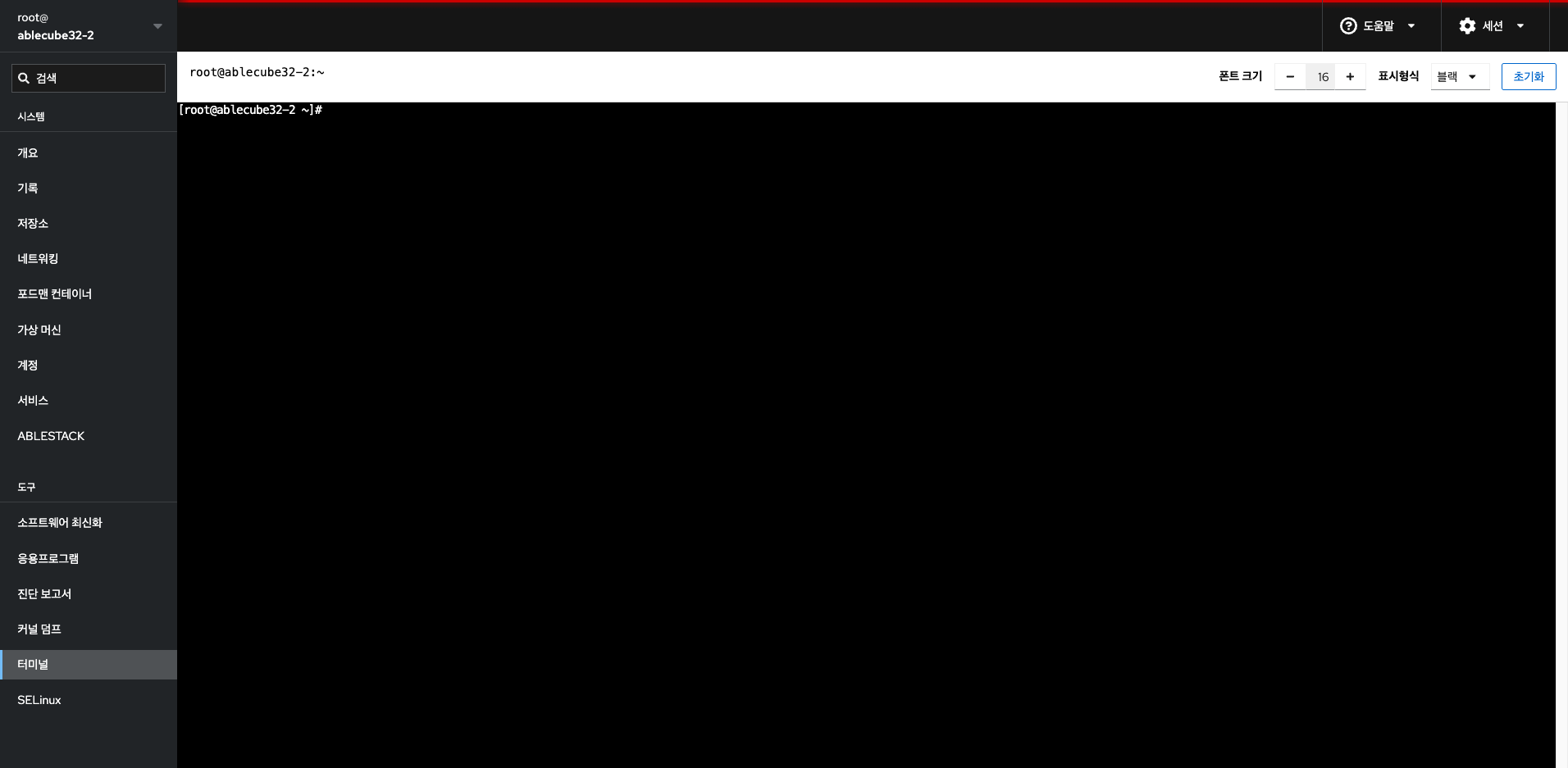 터미널(Terminal) 메뉴는 웹 브라우저 상에서 직접 서버의 셸(Shell)에 접속하여 명령어를 실행할 수 있는 기능입니다. CLI 명령어가 필요한 고급 작업을 GUI 환경에서도 수행할 수 있도록 돕습니다.