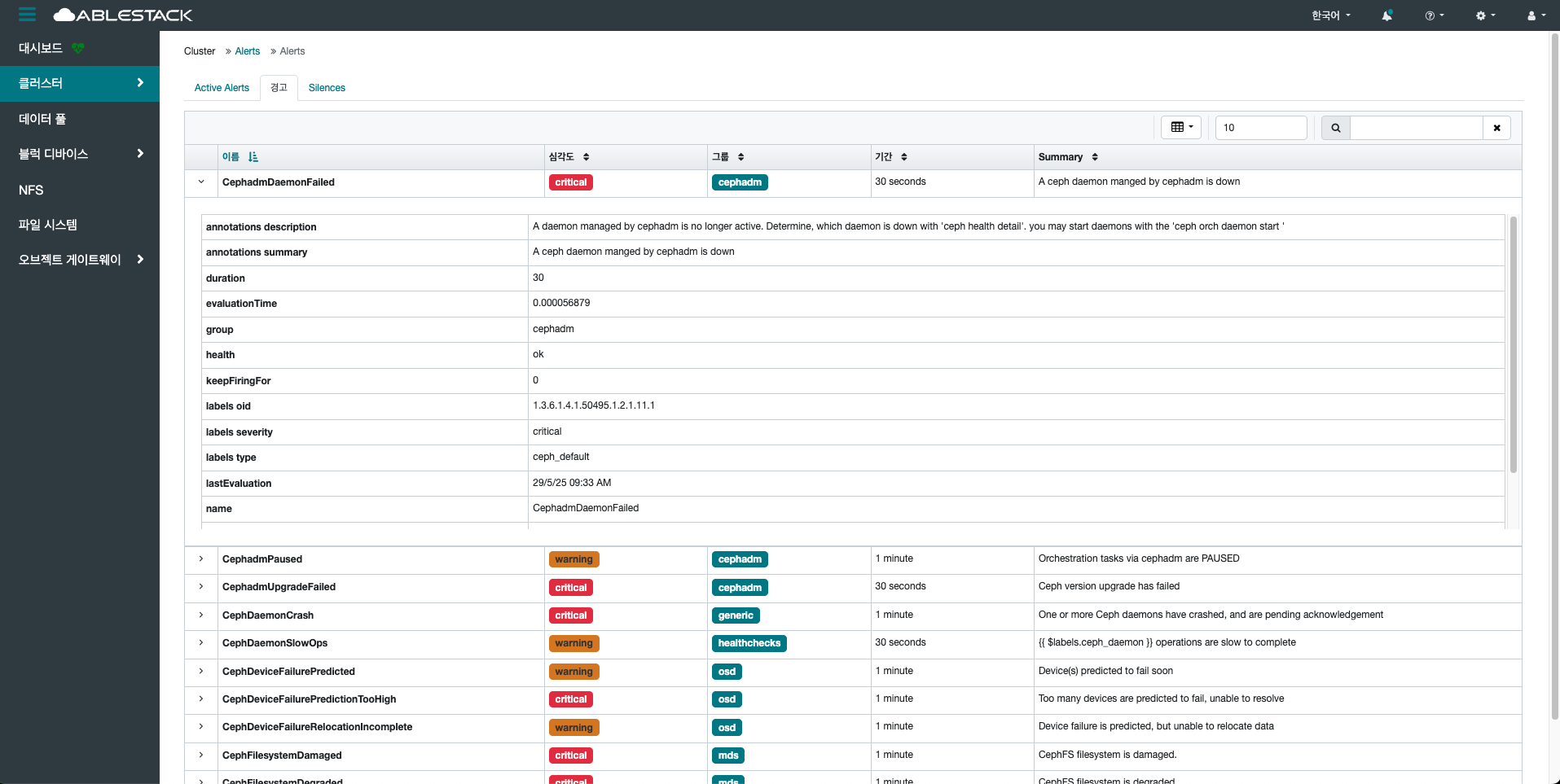클러스터 상태에 이상 징후가 감지되었을 때 관리자에게 경고를 전달하는 시스템입니다. 이 경고는 Prometheus 기반의 모니터링 구조와 연동되어 실시간으로 수집된 메트릭을 기준으로 트리거됩니다. 알림은 일반적으로 OSD, MON, MGR, MDS 등의 데몬 상태나 디스크 사용률, PG 상태 불안정, 네트워크 지연 등 주요 이벤트에 대해 발생합니다.