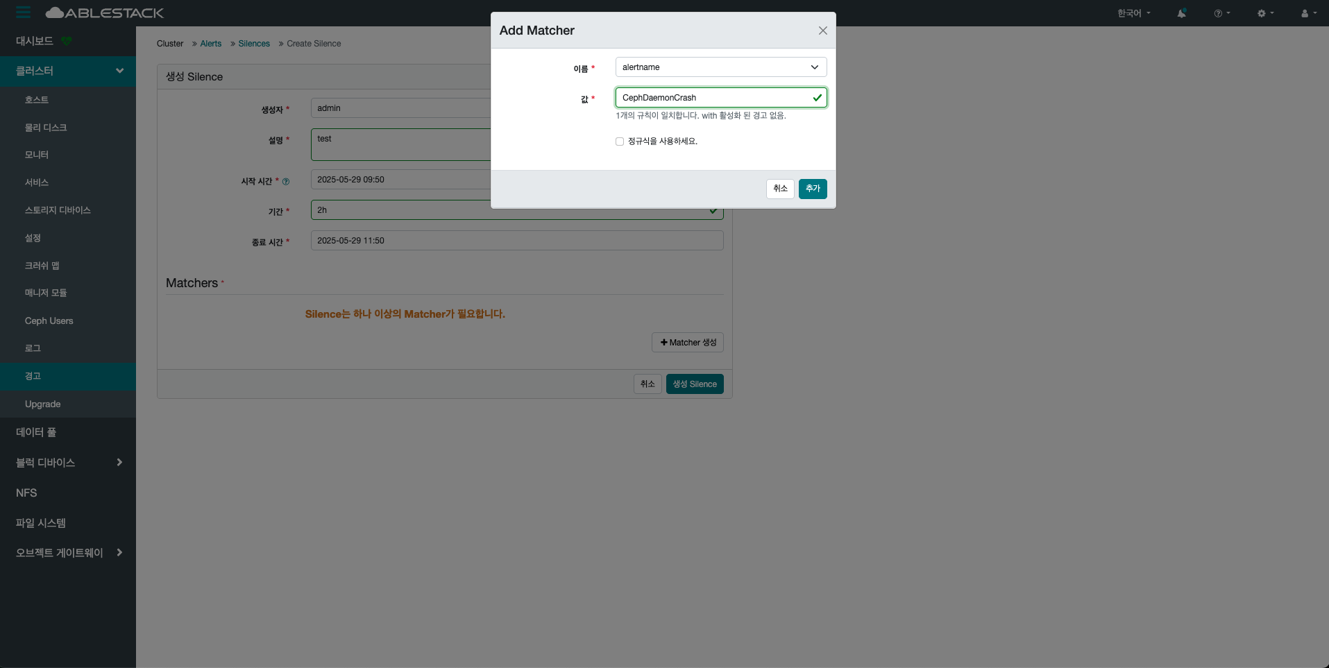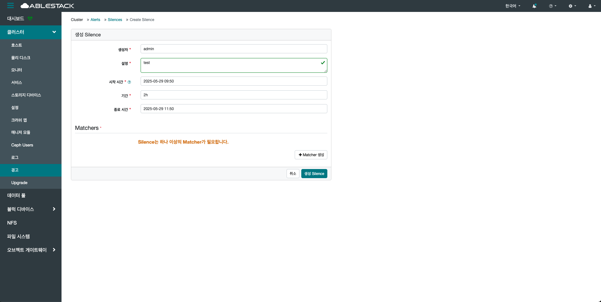 - Silences 생성 시, 하나 이상의 Matcher가 필요합니다. Matcher 생성 버튼을 클릭한 화면입니다.