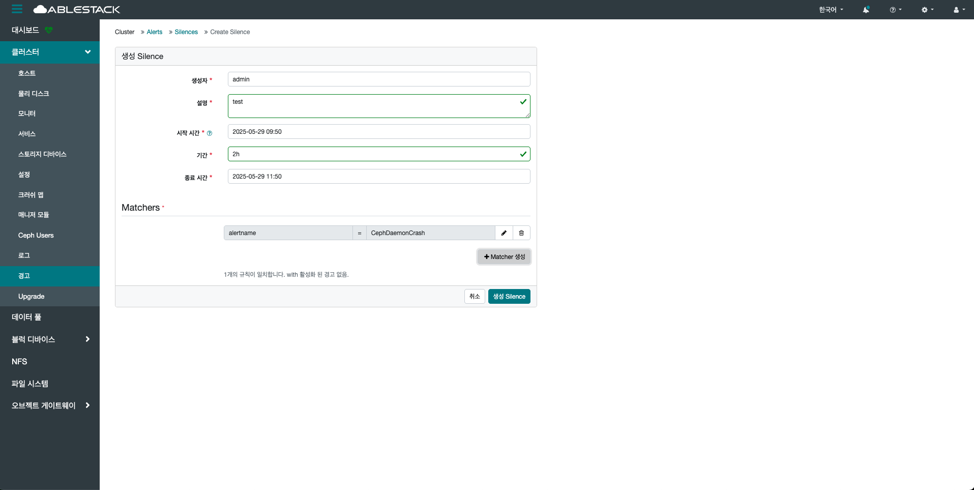 - 특정 경고를 일정 시간 동안 무시하도록 설정하는 기능입니다. 이는 유지보수 작업, 테스트 환경, 혹은 반복적으로 발생하는 경고를 임시로 차단할 때 유용하게 사용됩니다. 아이디 상단의 생성 버튼을 클릭합니다.