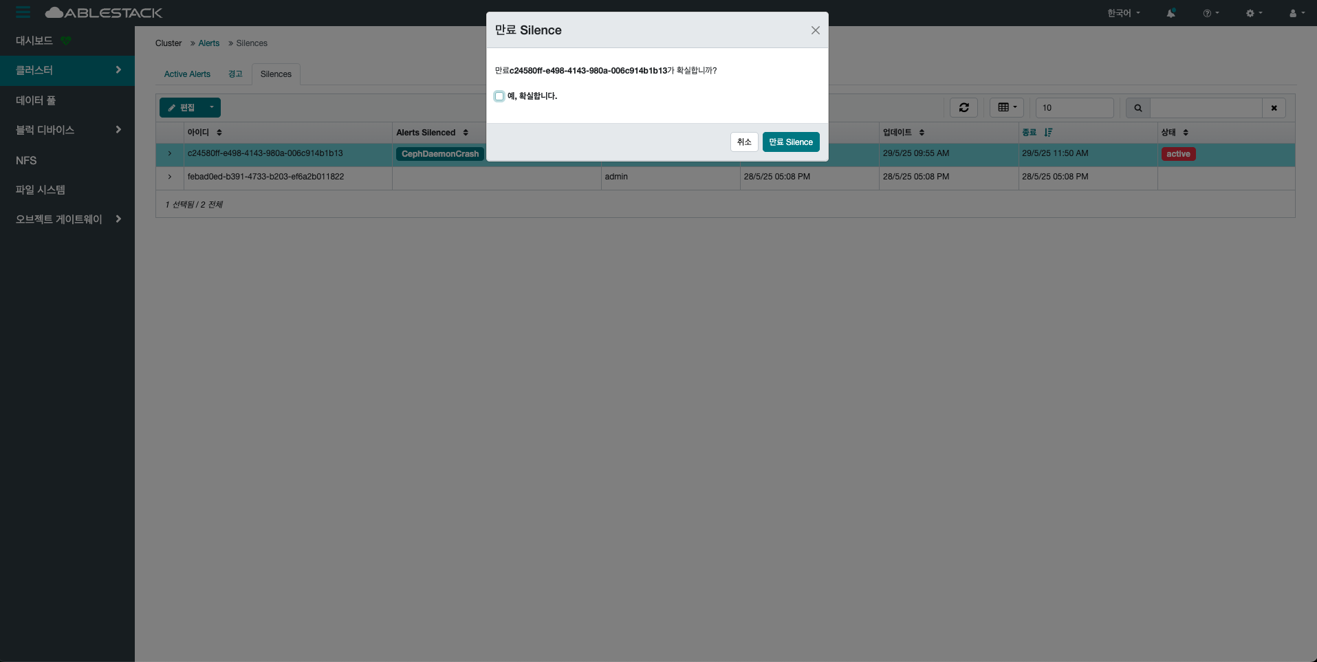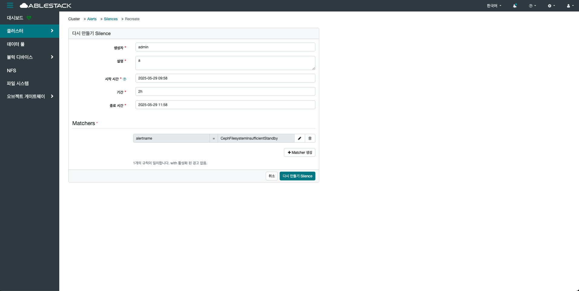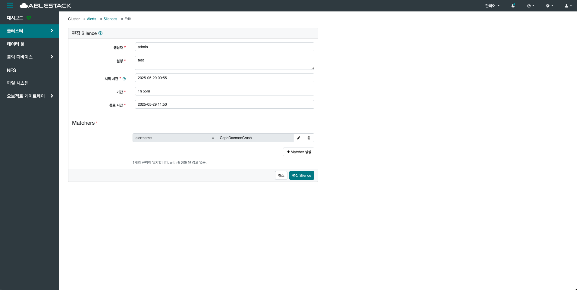 - 실행 중인 Silence를 설정 변경할 수 있는 기능입니다. 해당 상태가 active일 경우 활성화됩니다.
